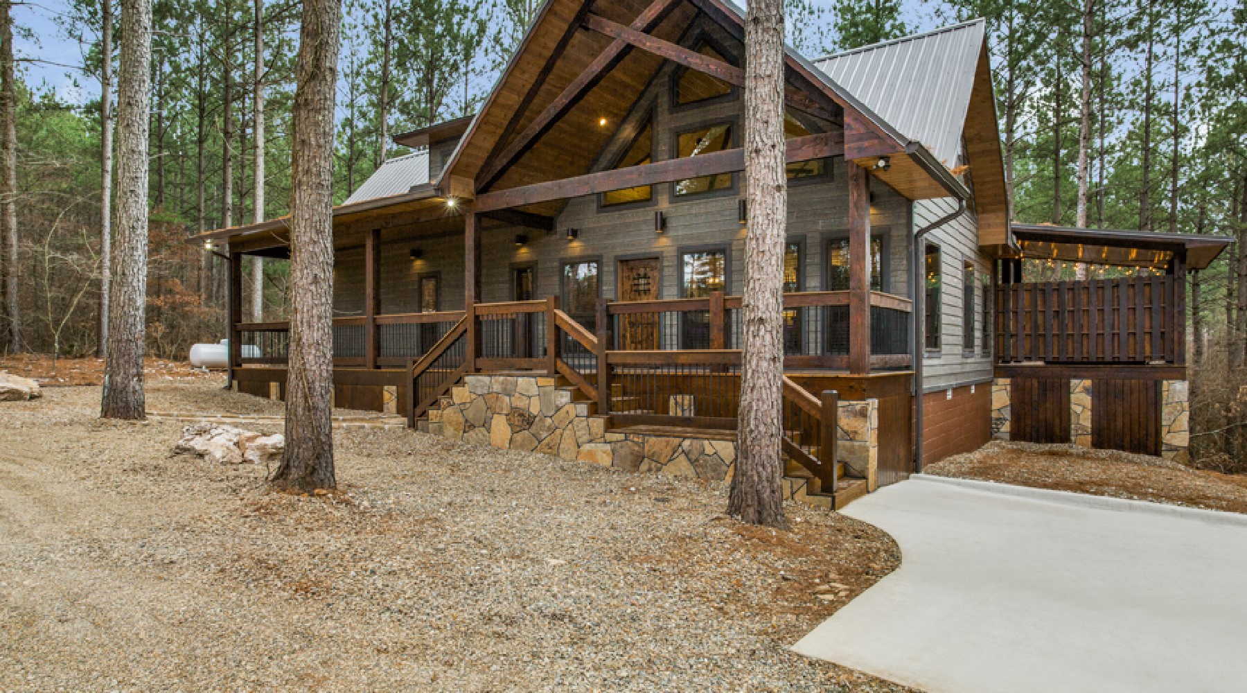 A bistro style table and gas grill (propane provided) as well as seating by the gas log fire place with easy on timer switch (seasonal October 15th – April 15th) are located on the outdoor decks. There is an HDTV with DirecTV package (PPV not provided) and a 4-5 person hot tub. The driveway can accompany cars and trailers. Holly Creek is just minutes from Hochatown attractions and restaurants.