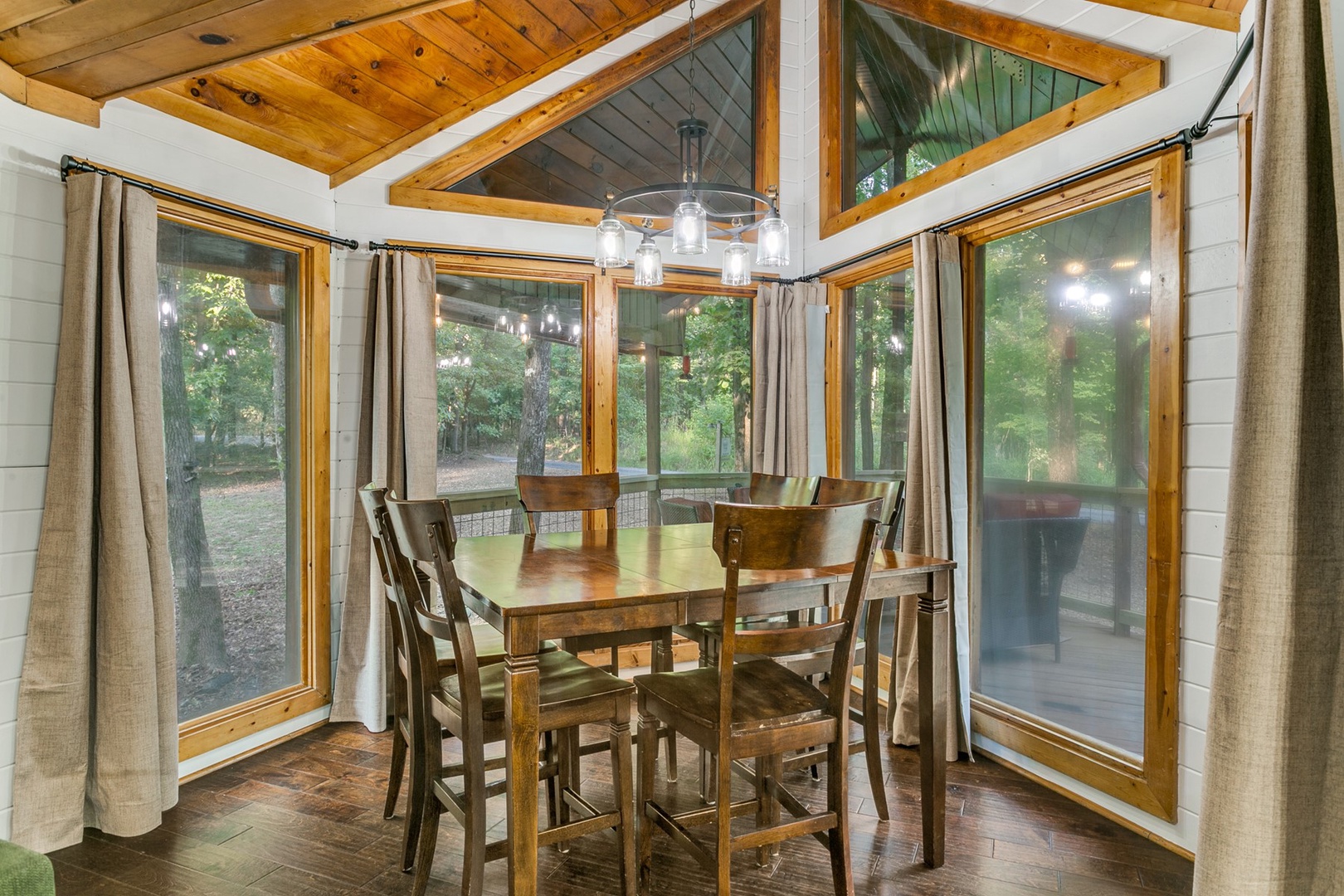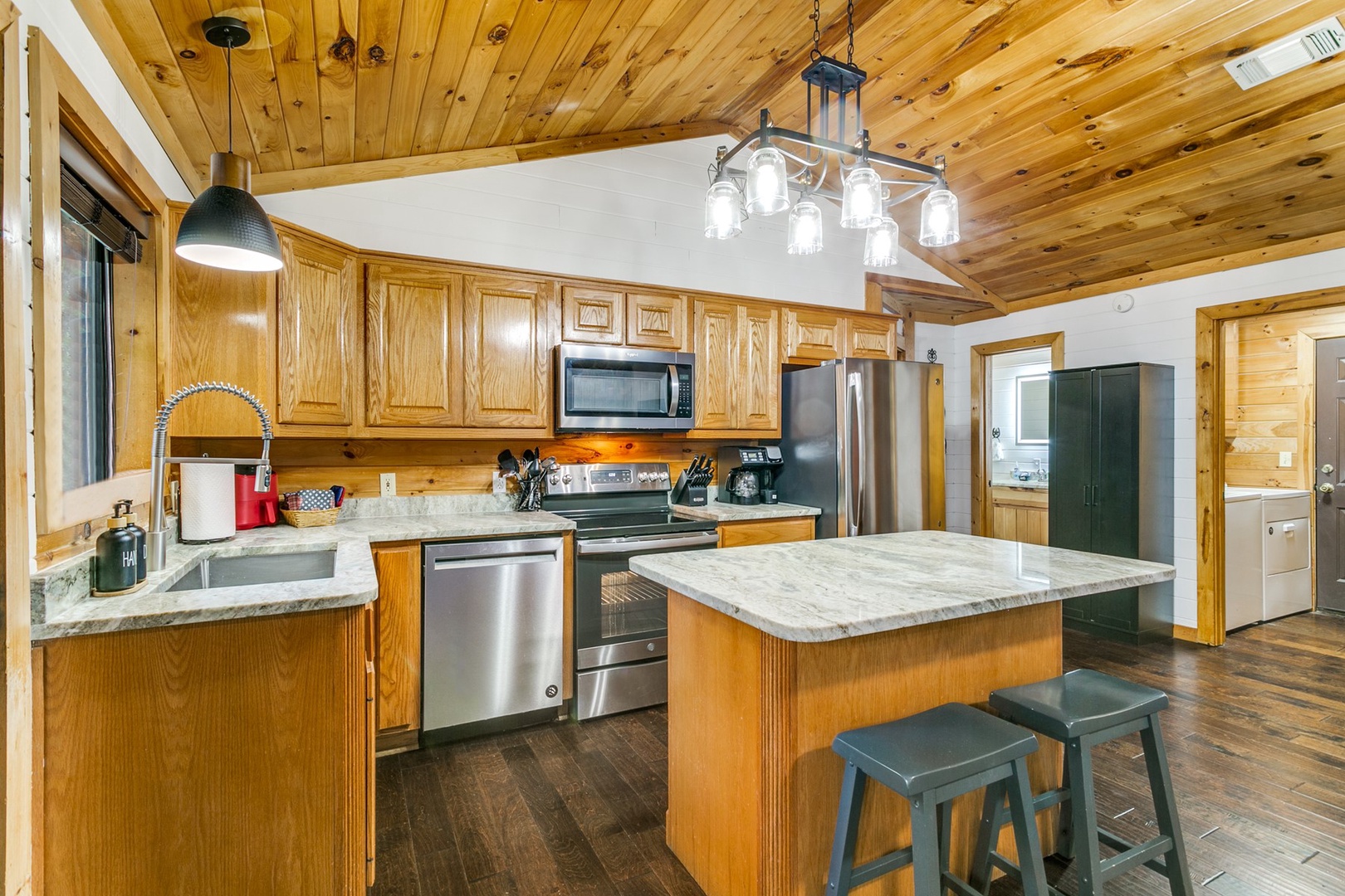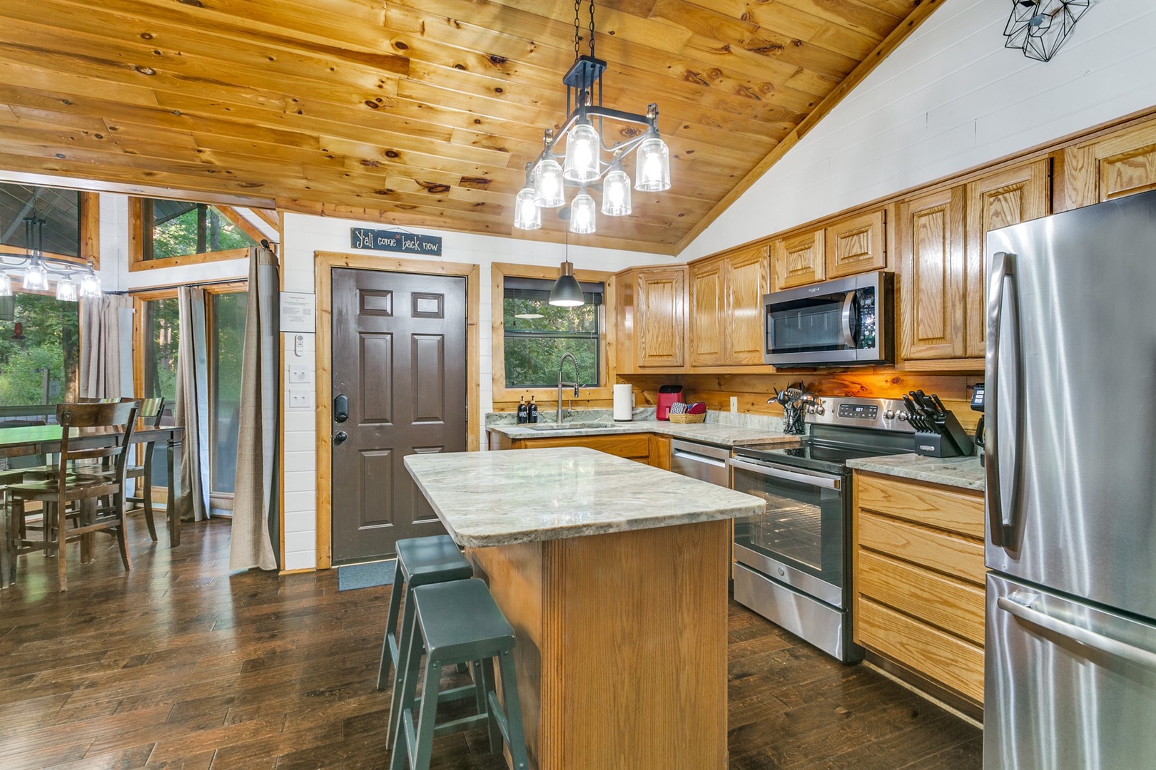 The Star Of Hochatown has one king bedroom, one queen bedroom and two full baths. There is a sofa sleeper in the living area for extra guests. The kitchen is equipped with everything you’ll need to prepare a full course meal for your family and friends. After dinner just load up the dishwasher and sit back and relax in front of the wood burning fireplace. The cabin is complete with washer/dryer and central air and heat. The perfect way to go camping!