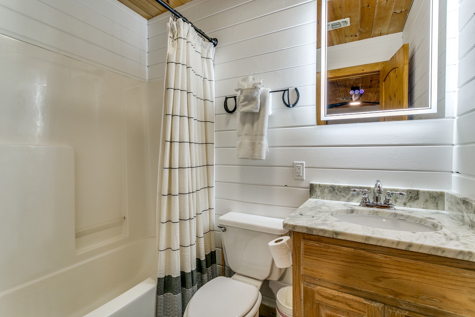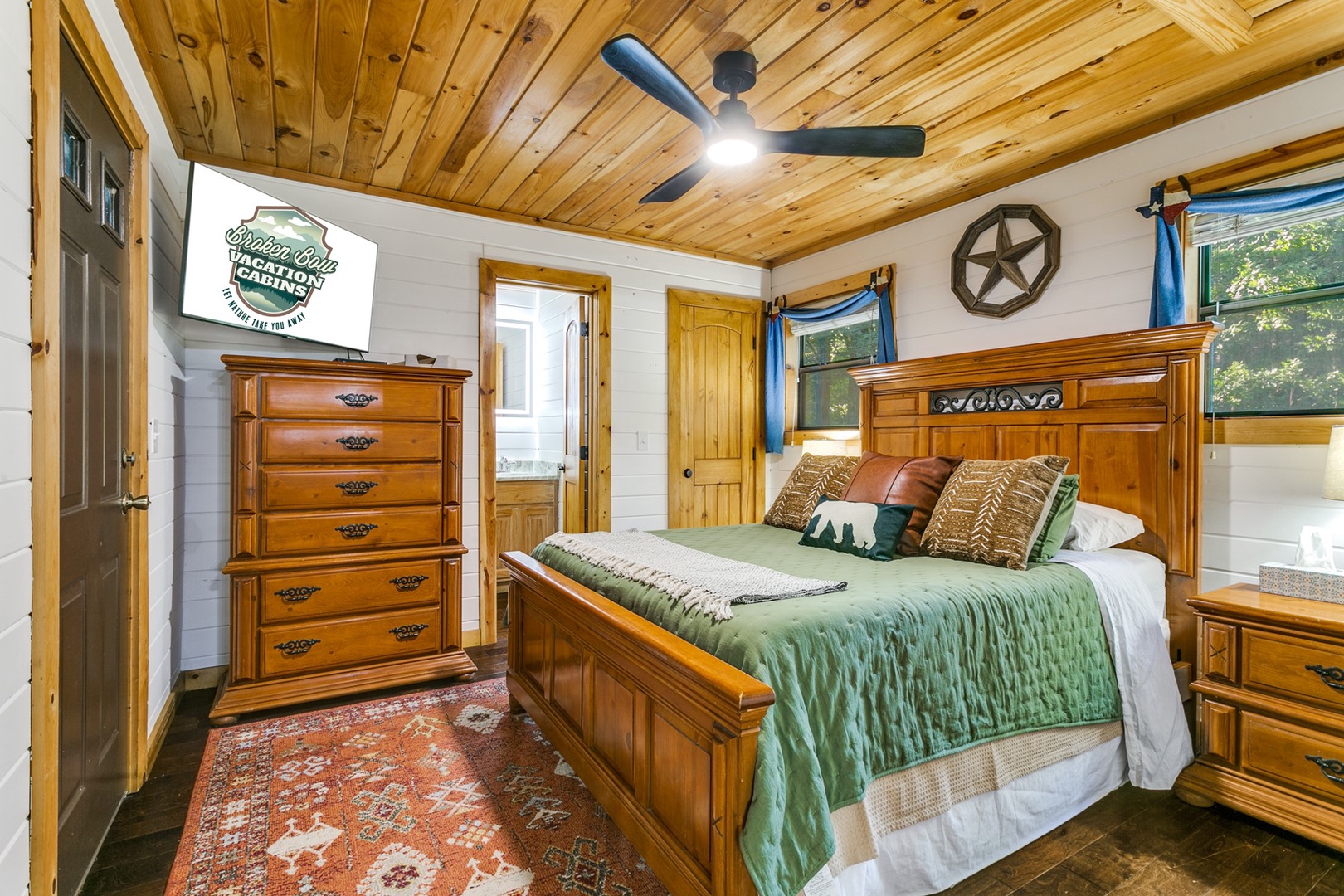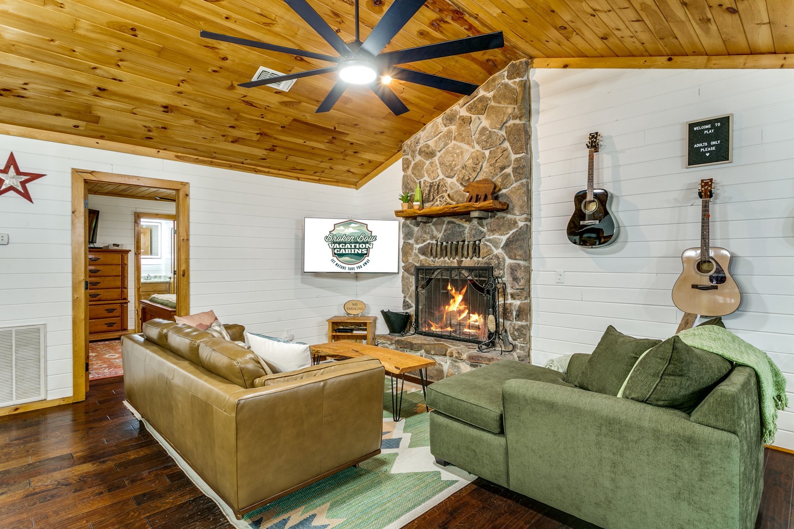 The Star Of Hochatown has one king bedroom, one queen bedroom and two full baths. There is a sofa sleeper in the living area for extra guests. The kitchen is equipped with everything you’ll need to prepare a full course meal for your family and friends. After dinner just load up the dishwasher and sit back and relax in front of the wood burning fireplace. The cabin is complete with washer/dryer and central air and heat. The perfect way to go camping!