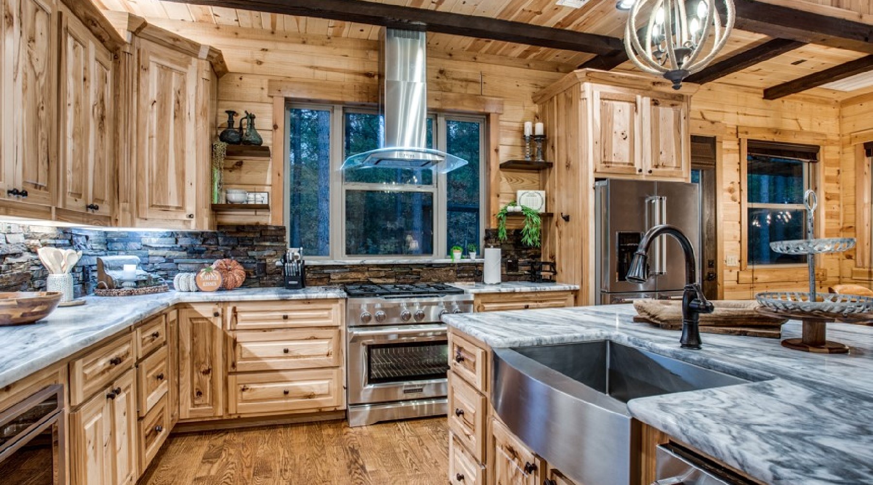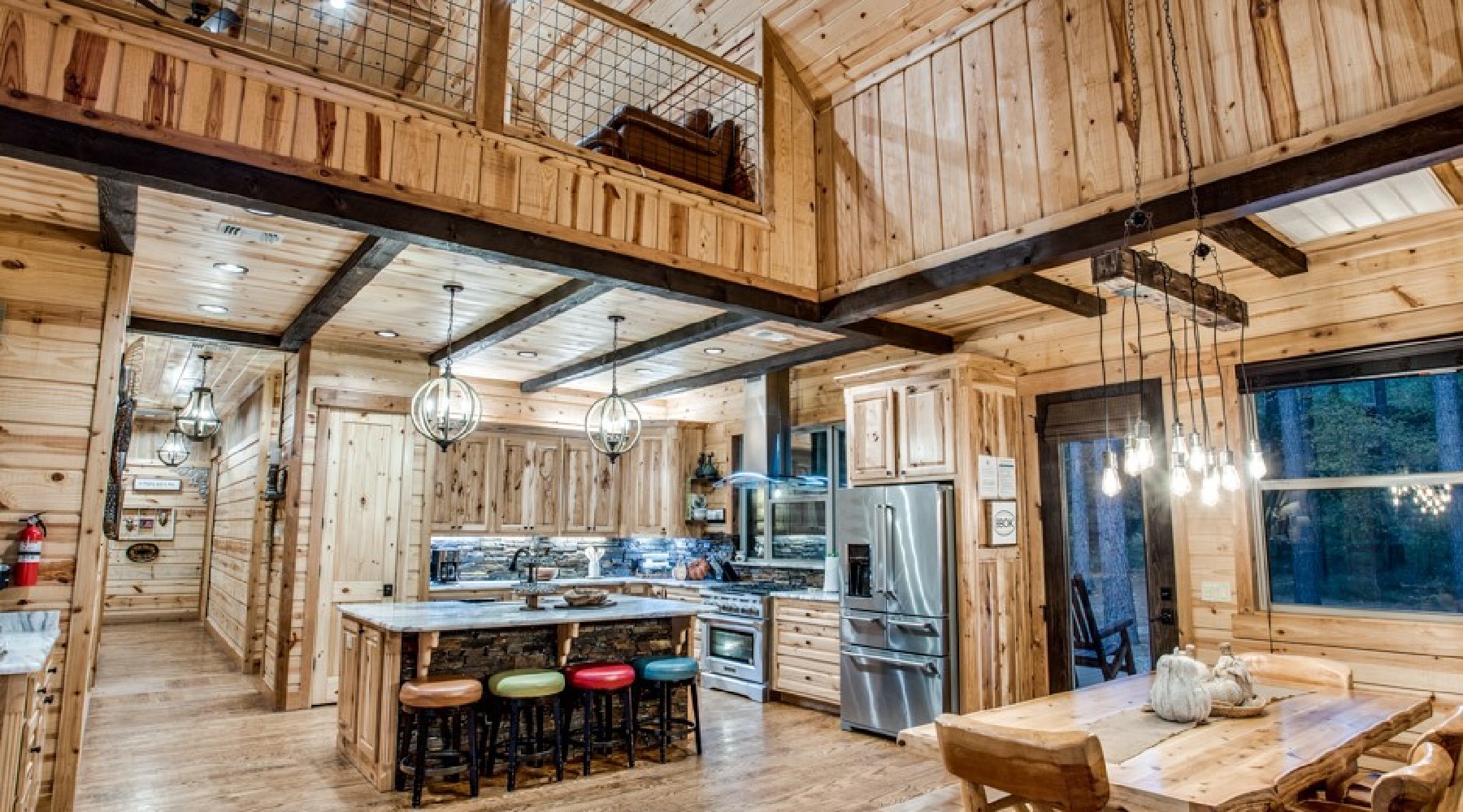 The kitchen is equipped with a gas cook top with electric oven, side-by-side refrigerator, microwave, large farm basin sink, and beautiful granite counter tops. The plentiful cabinets are stocked with dishes, glassware, eating utensils, bake ware, pots & pans and cooking utensils. Dining for multiple guests can be accommodated with the large table or island counter bar stool seating.