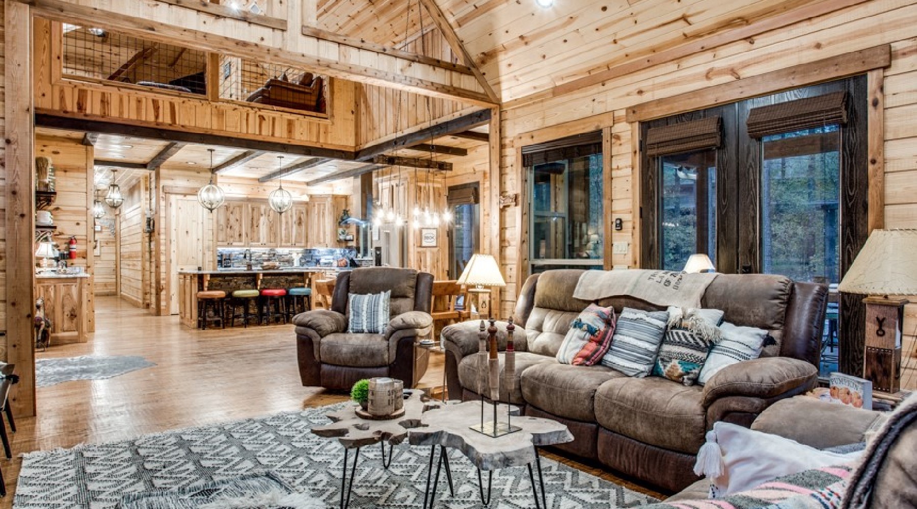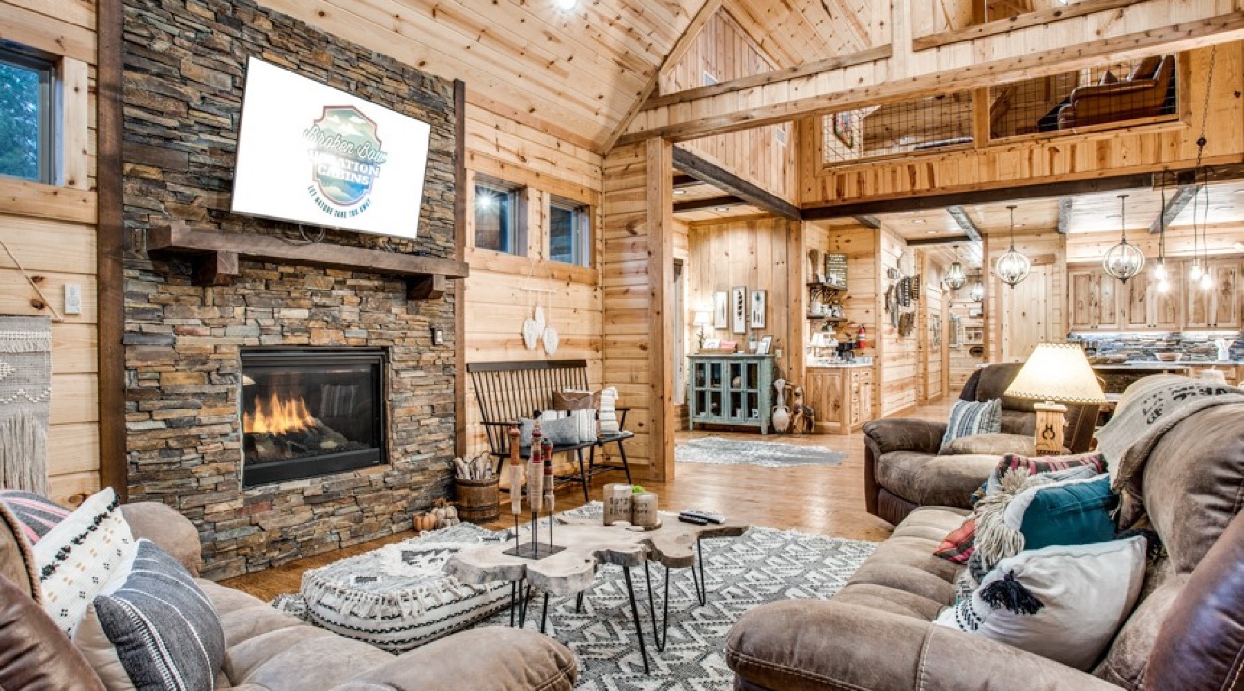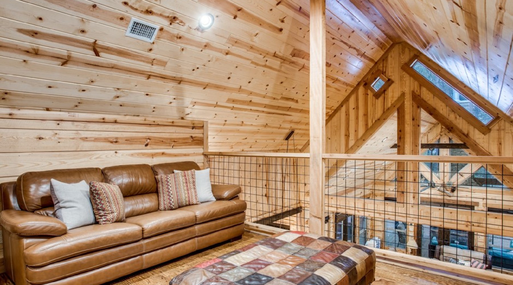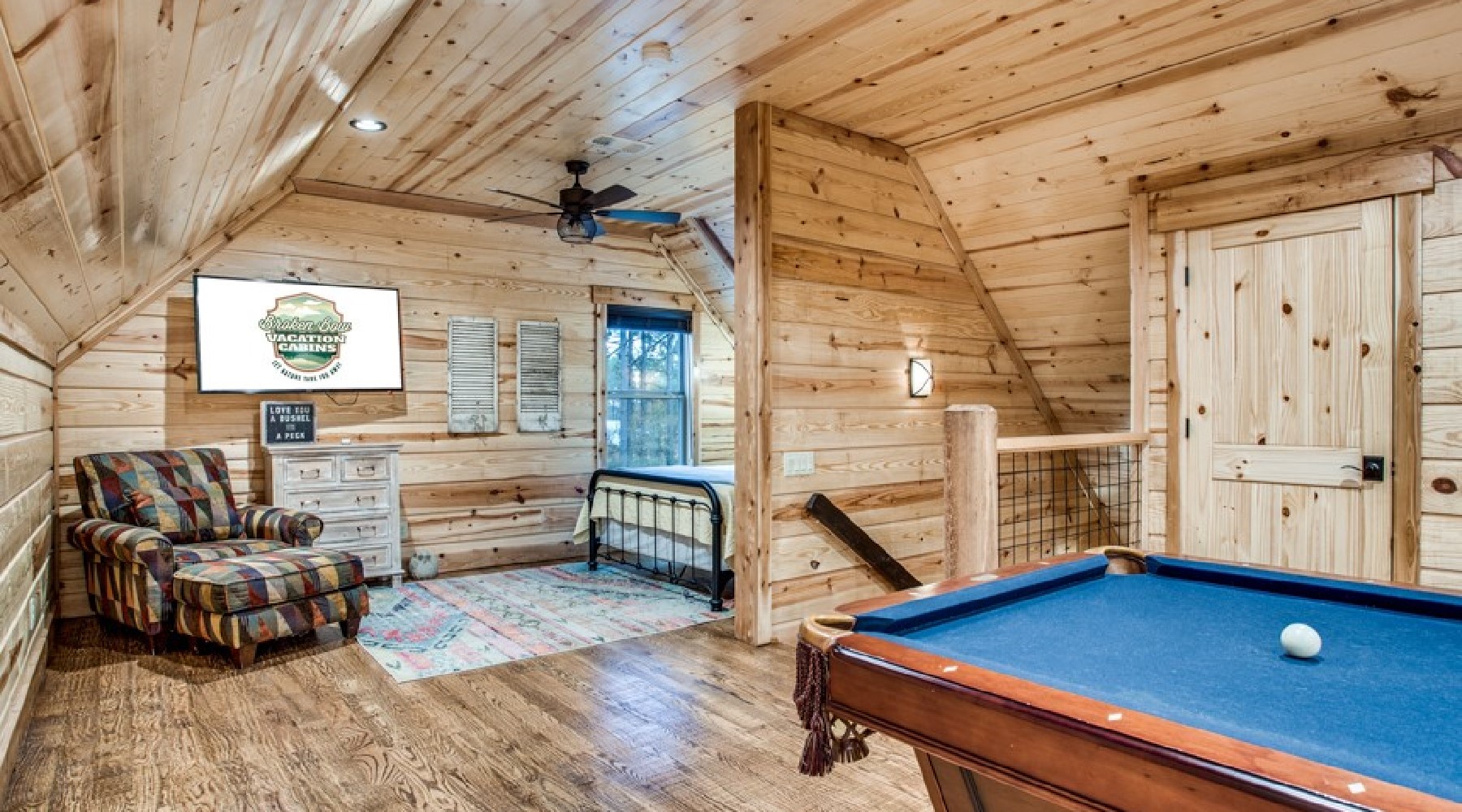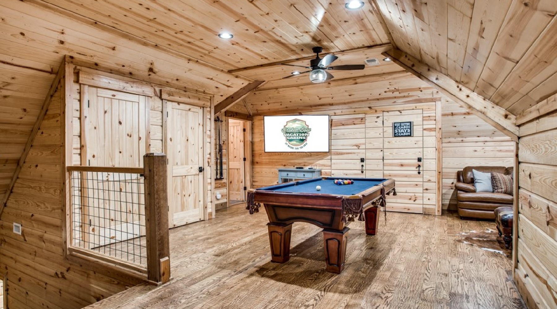 Downstairs are five of the bedrooms. The Eagles Nest is a king bed master suite located to the right off the hallway. A private bath is within the suite with a large tile shower and double vanity. This bedroom has a private door to the back deck and hot tub area. There is a second sitting porch that is shared with the Bear Lair off of this bedroom. The Grey Wolf is a king bed master suite located to the left of the hallway. This bedroom has an attached bath with shower and double vanities. The Coyote Cave bedroom is furnished with a queen bed. This bedroom has an attached bathroom with shower/tub combo and single vanity. Down the hallway is the Bear Lair with a king bed and a door to the sitting porch shared with the Eagles Nest. This bedroom shares a Jack-N-Jill bathroom with the Bunk Hall. The Bunk Hall has four twin bunks. All bedrooms have flat screen TV with DirecTV package (PPV not available). The laundry closet is located in the hallway and holds a full-size washer and dryer. Upstairs has an open game room/entertainment area with pool table, sofa and flat screen TV with Direct TV package (PPV not available), and reading nook along with a sleeping area with queen bed. There is a half bath upstairs.