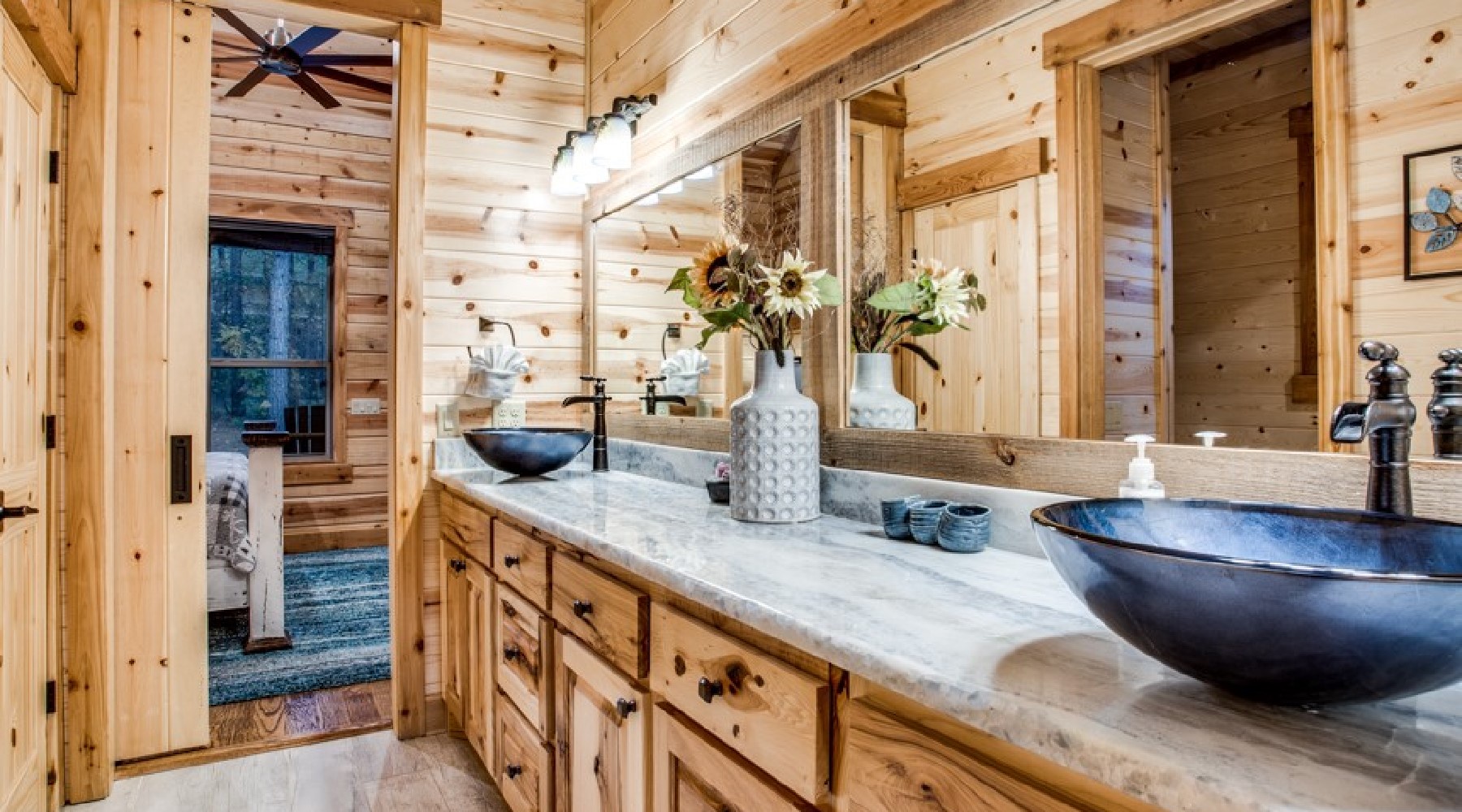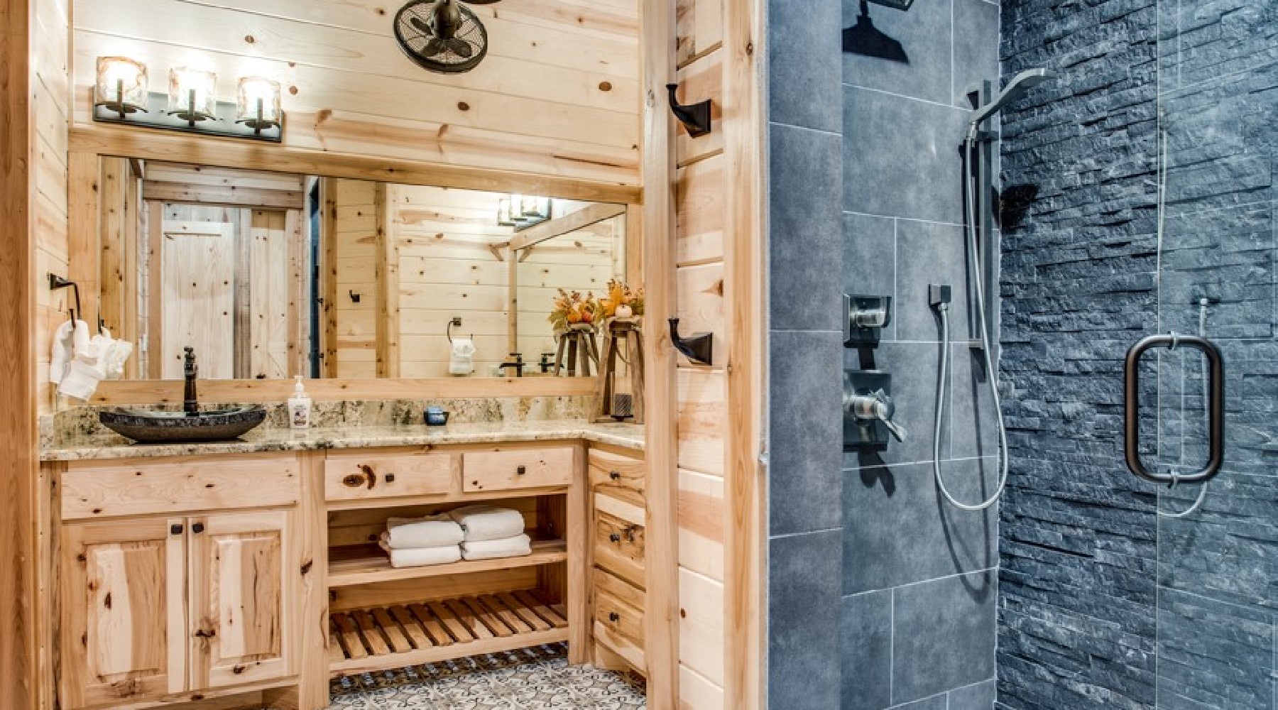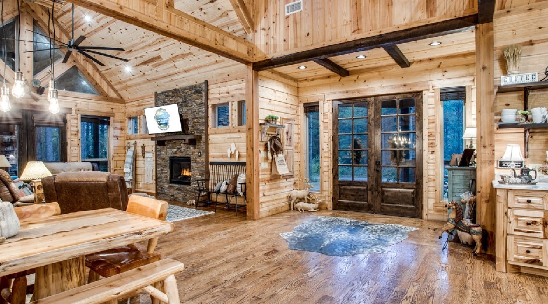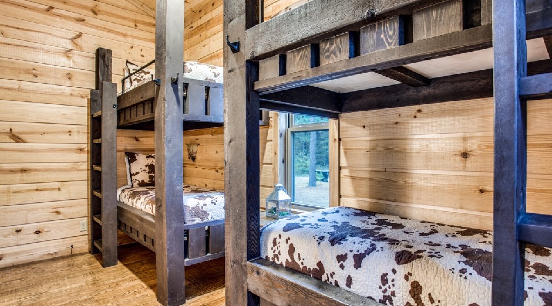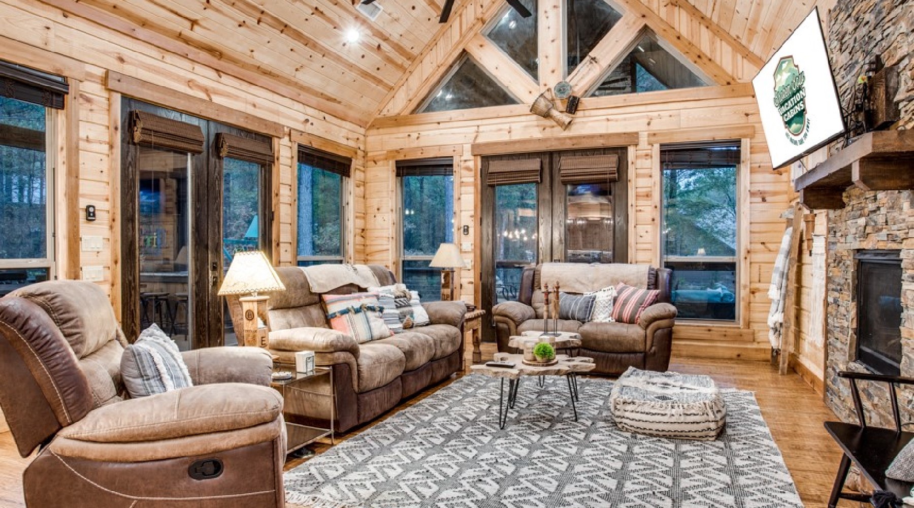 Downstairs are five of the bedrooms. The Eagles Nest is a king bed master suite located to the right off the hallway. A private bath is within the suite with a large tile shower and double vanity. This bedroom has a private door to the back deck and hot tub area. There is a second sitting porch that is shared with the Bear Lair off of this bedroom. The Grey Wolf is a king bed master suite located to the left of the hallway. This bedroom has an attached bath with shower and double vanities. The Coyote Cave bedroom is furnished with a queen bed. This bedroom has an attached bathroom with shower/tub combo and single vanity. Down the hallway is the Bear Lair with a king bed and a door to the sitting porch shared with the Eagles Nest. This bedroom shares a Jack-N-Jill bathroom with the Bunk Hall. The Bunk Hall has four twin bunks. All bedrooms have flat screen TV with DirecTV package (PPV not available). The laundry closet is located in the hallway and holds a full-size washer and dryer. Upstairs has an open game room/entertainment area with pool table, sofa and flat screen TV with Direct TV package (PPV not available), and reading nook along with a sleeping area with queen bed. There is a half bath upstairs.