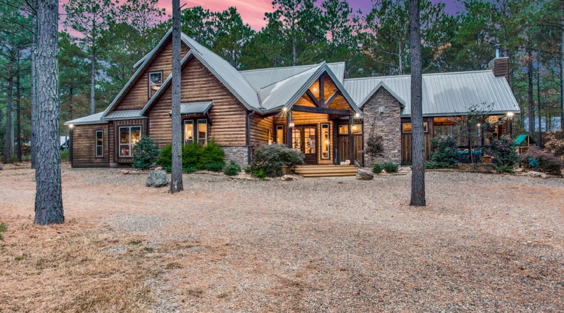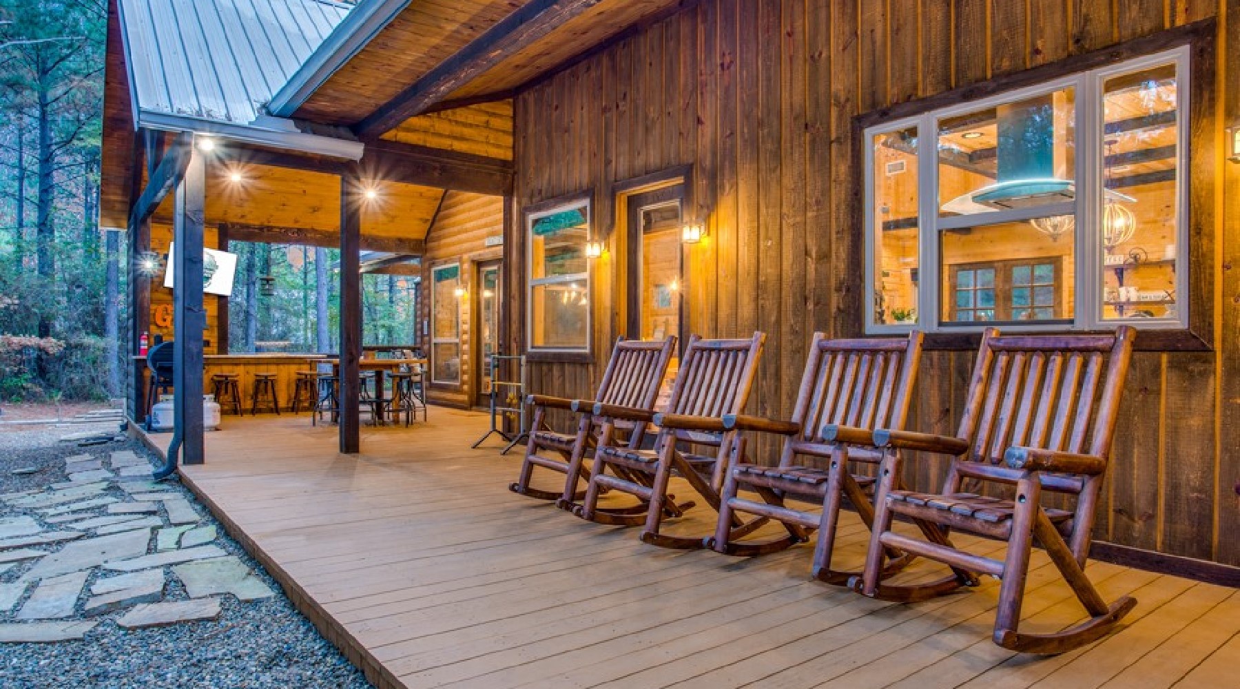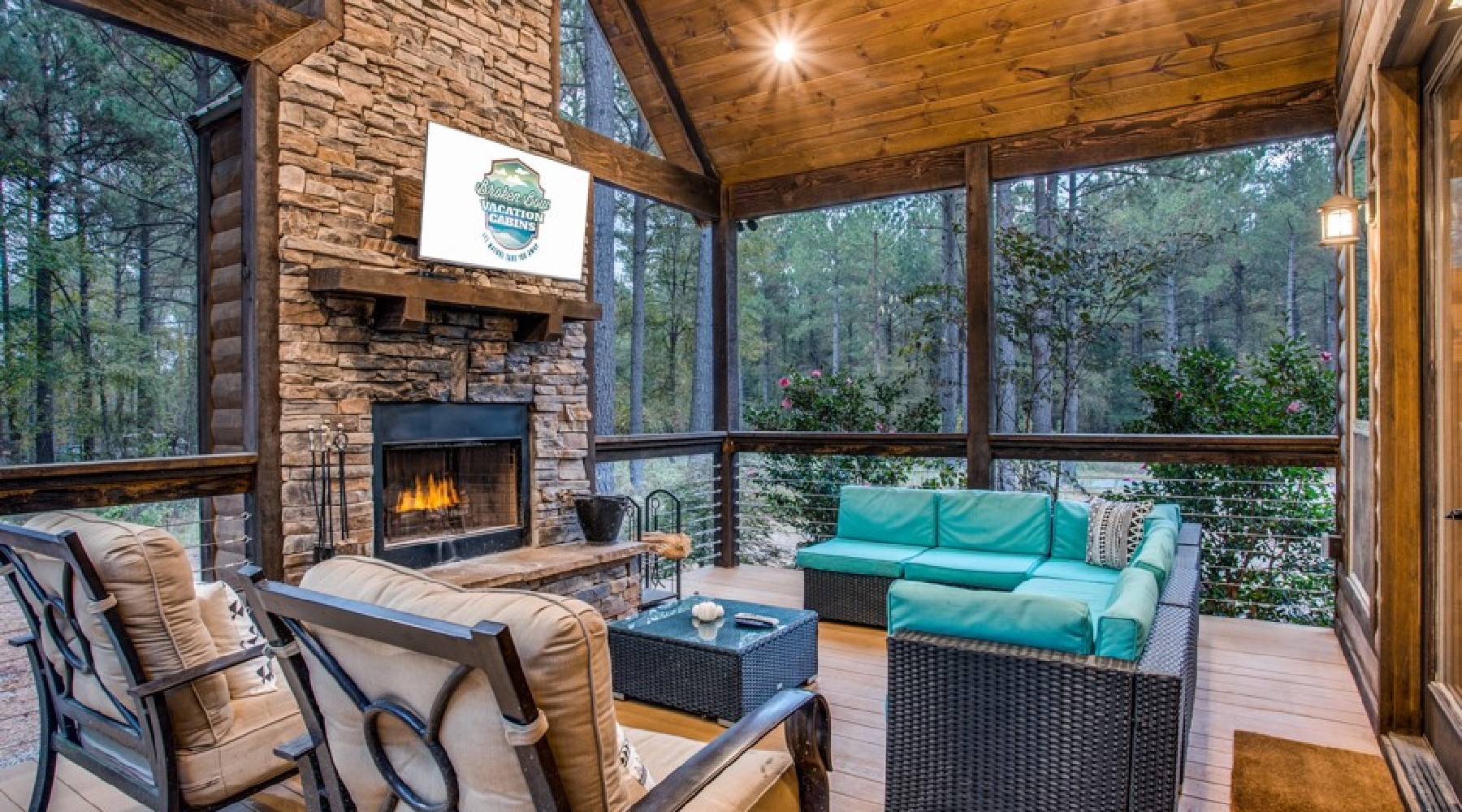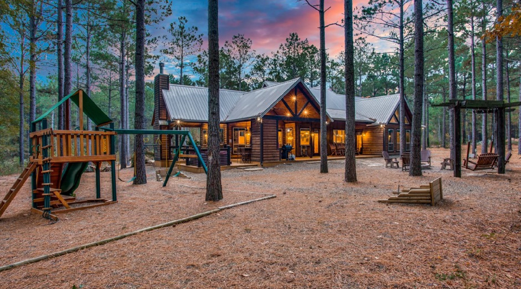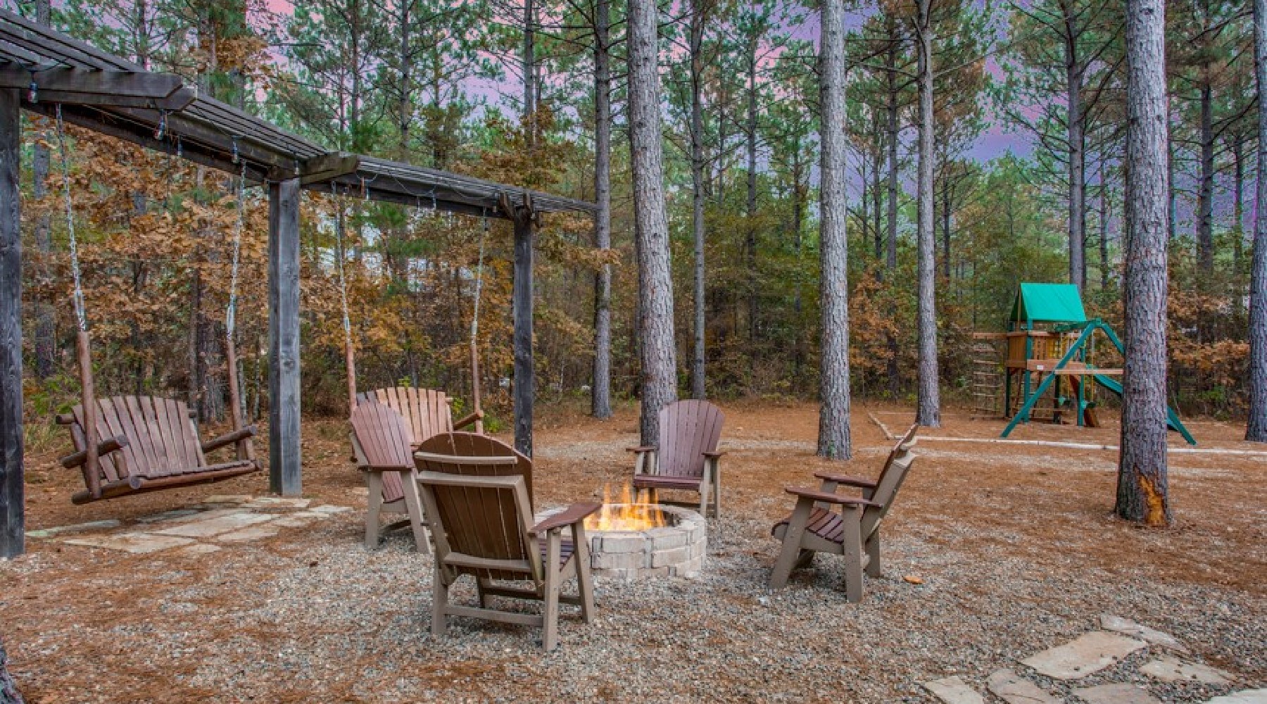 The outdoor deck and yard area offers multiple seating options, a large dining table, gas cooking grill (propane provided) granite counters for meal preparation and serving along with a seating arrangement in front of a wood burning fireplace . There are two flat screen TVs outside- one mounted over the fireplace then one in the outdoor kitchen area. On the gravel yard there is a circular fire pit for wood burning fires where you can roast marshmallows for making S’mores. There is a child’s play set along with heavy double swings for the entire family to enjoy.