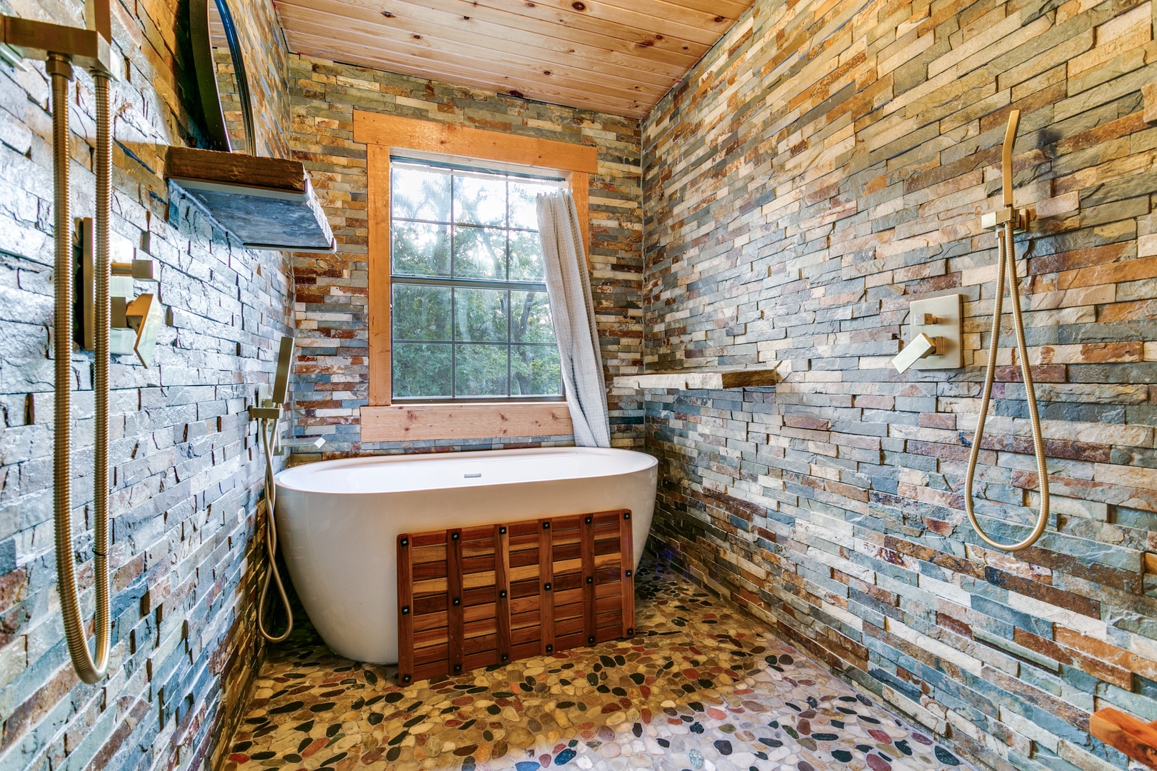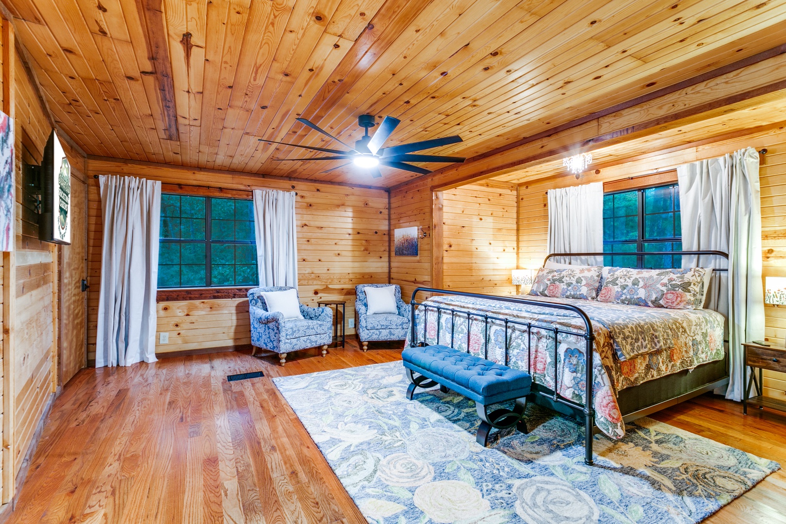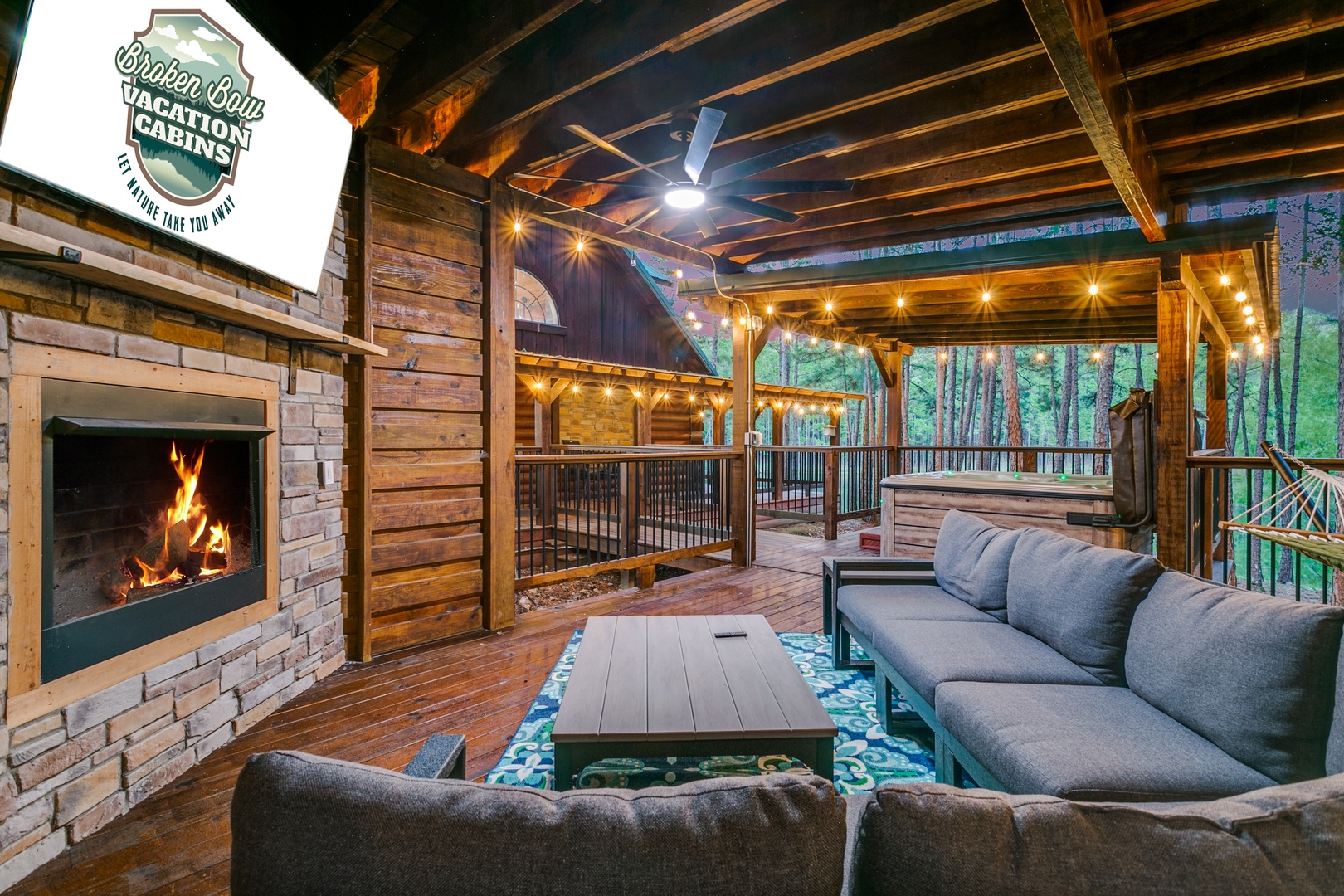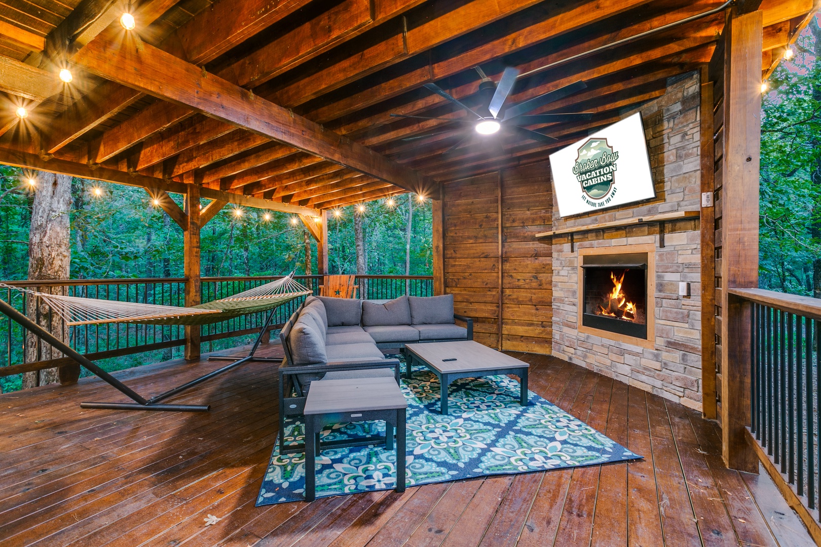 Beyond the interior, a spacious deck awaits, boasting a hot tub, fireplace, and outdoor Smart TV—ideal for relaxing or entertaining. Just steps away, a seasonal creek gently flows past the deck, enhancing the serene natural ambiance. Gather under the stars around a separate fire pit with seating for six, or unwind in the hammock by the pond, soaking in the tranquility of nature.