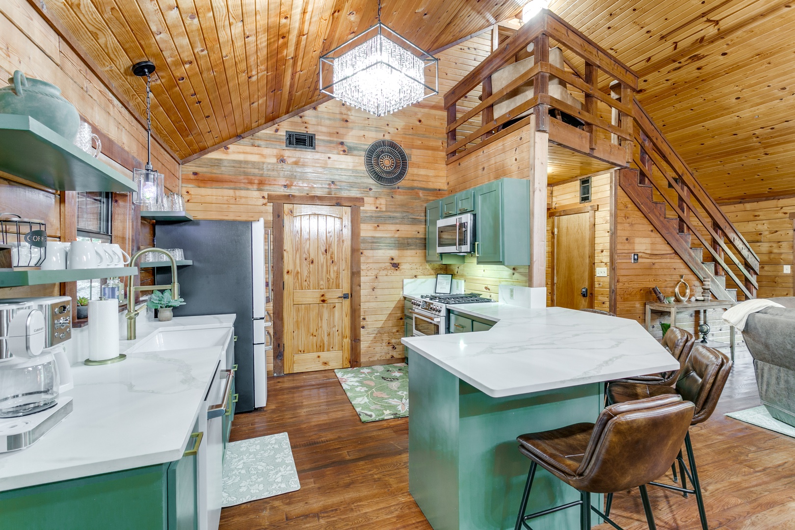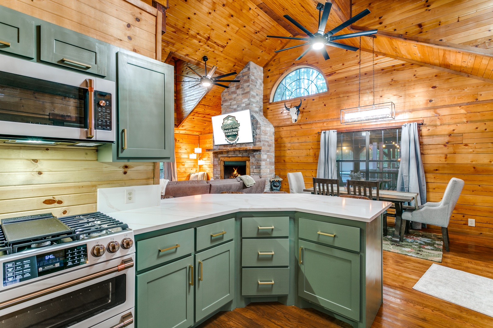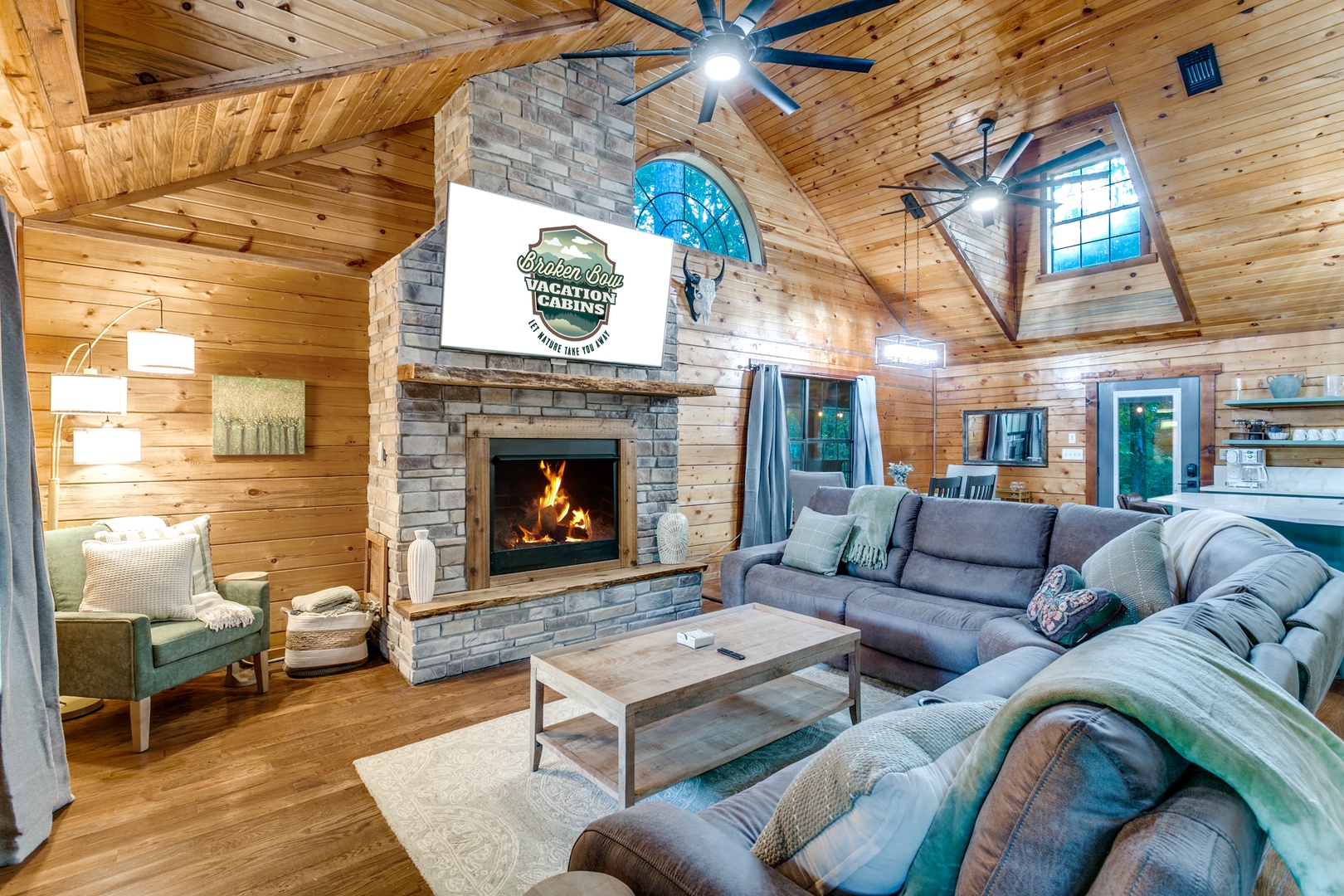 Step inside to a cozy living area featuring a fireplace, a reclining sectional, and an array of board games perfect for family nights. The cabin comfortably accommodates six guests with one king bed and two queen beds. Indulge in a spa-like experience in the luxurious bathroom, complete with both a shower and a soaking tub. The fully equipped kitchen seamlessly blends rustic charm with modern amenities, including a gas stove, air fryer, and blender, making meal preparation effortless, from quick snacks to full family dinners.