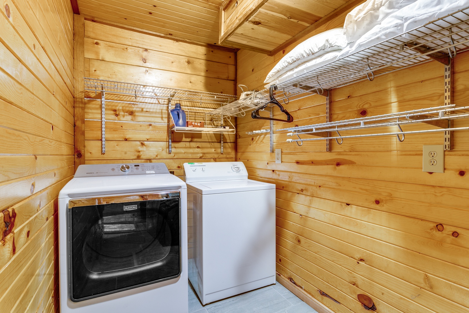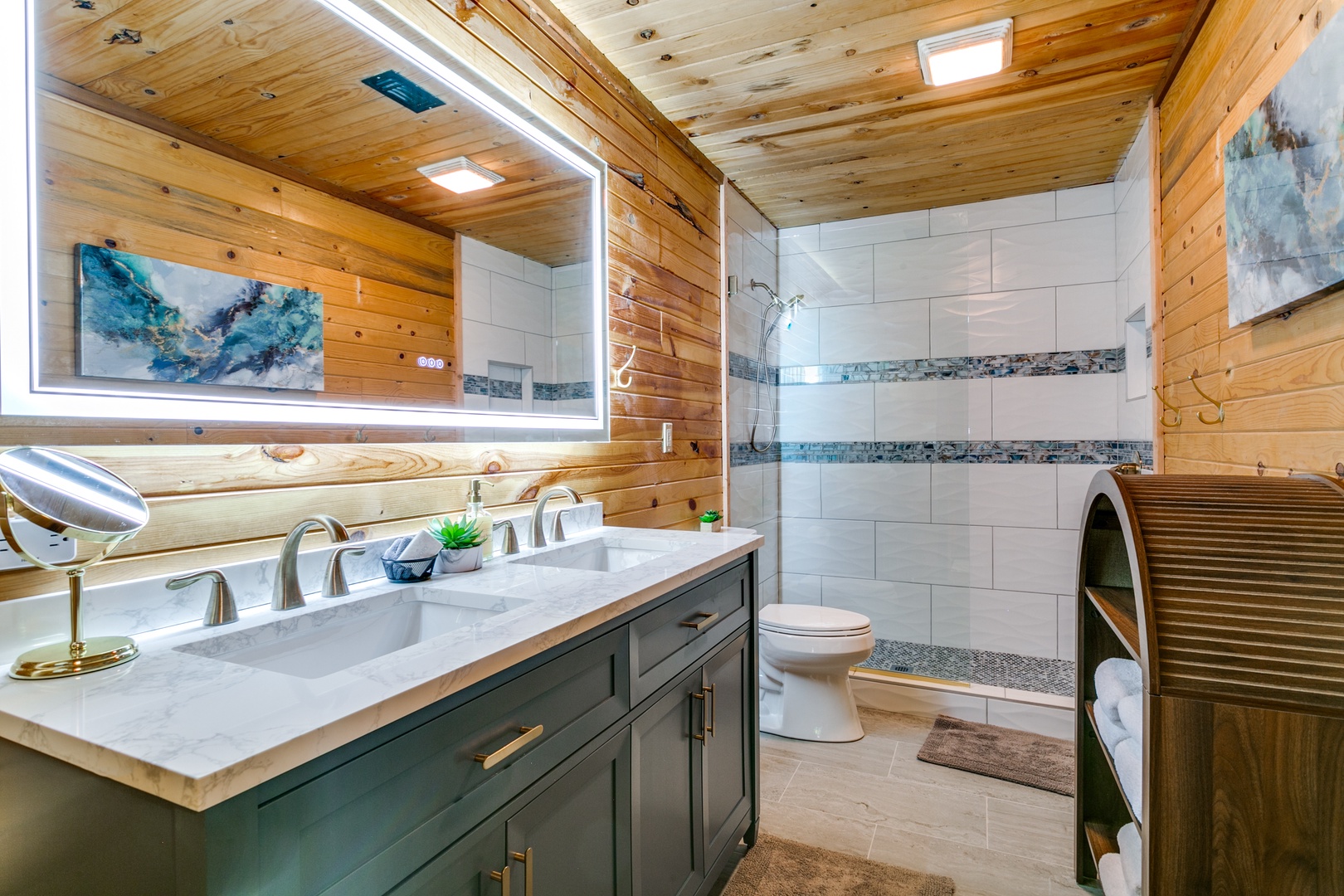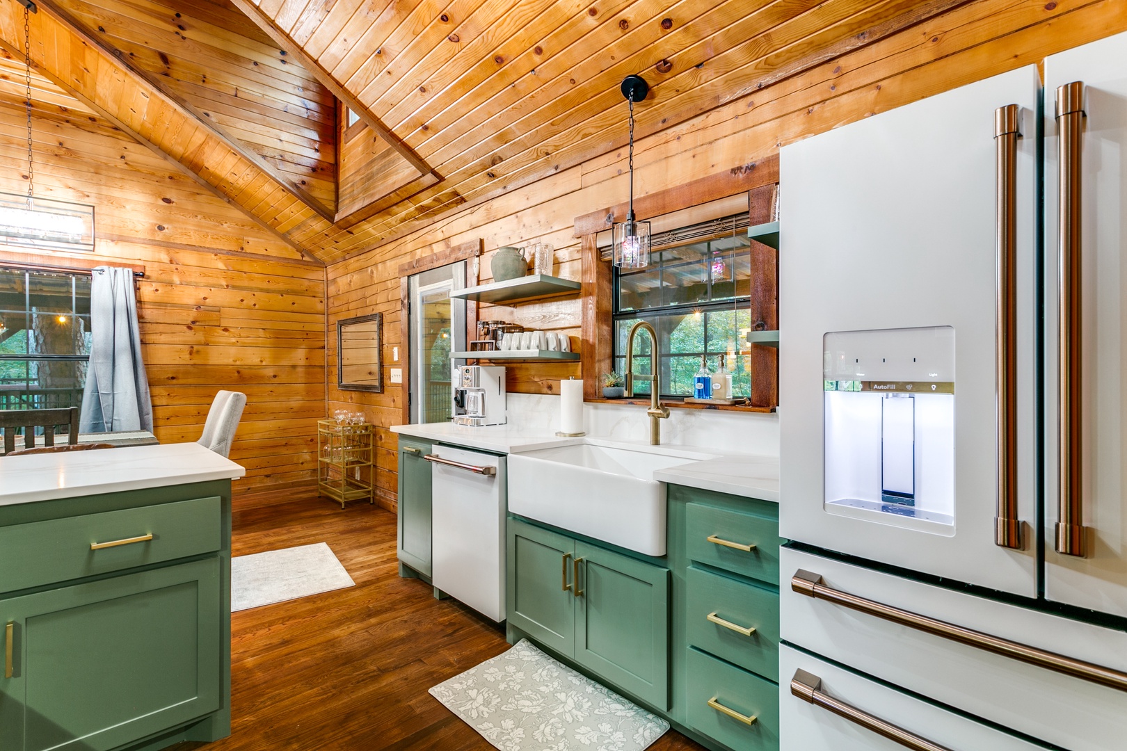 Step inside to a cozy living area featuring a fireplace, a reclining sectional, and an array of board games perfect for family nights. The cabin comfortably accommodates six guests with one king bed and two queen beds. Indulge in a spa-like experience in the luxurious bathroom, complete with both a shower and a soaking tub. The fully equipped kitchen seamlessly blends rustic charm with modern amenities, including a gas stove, air fryer, and blender, making meal preparation effortless, from quick snacks to full family dinners.