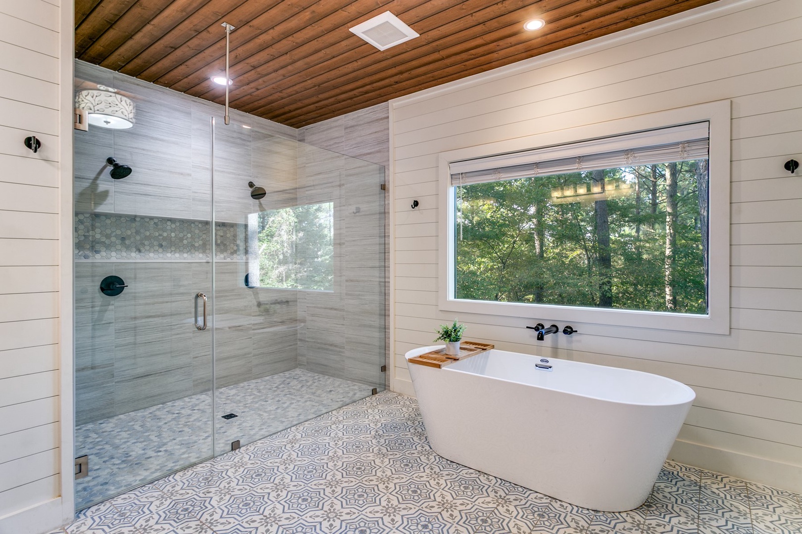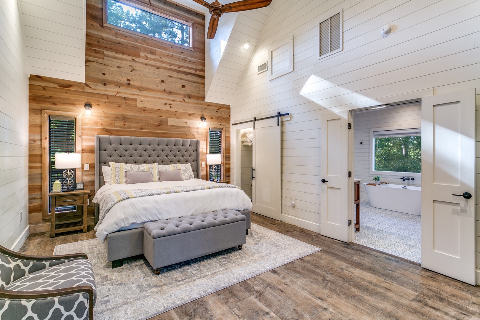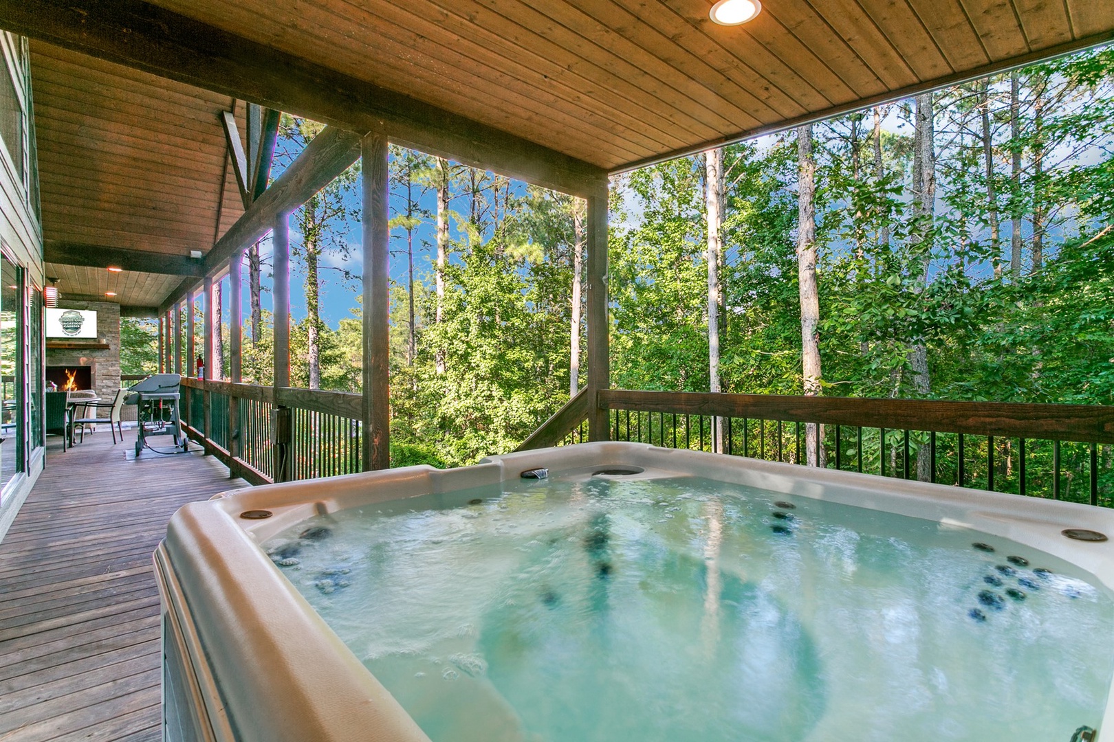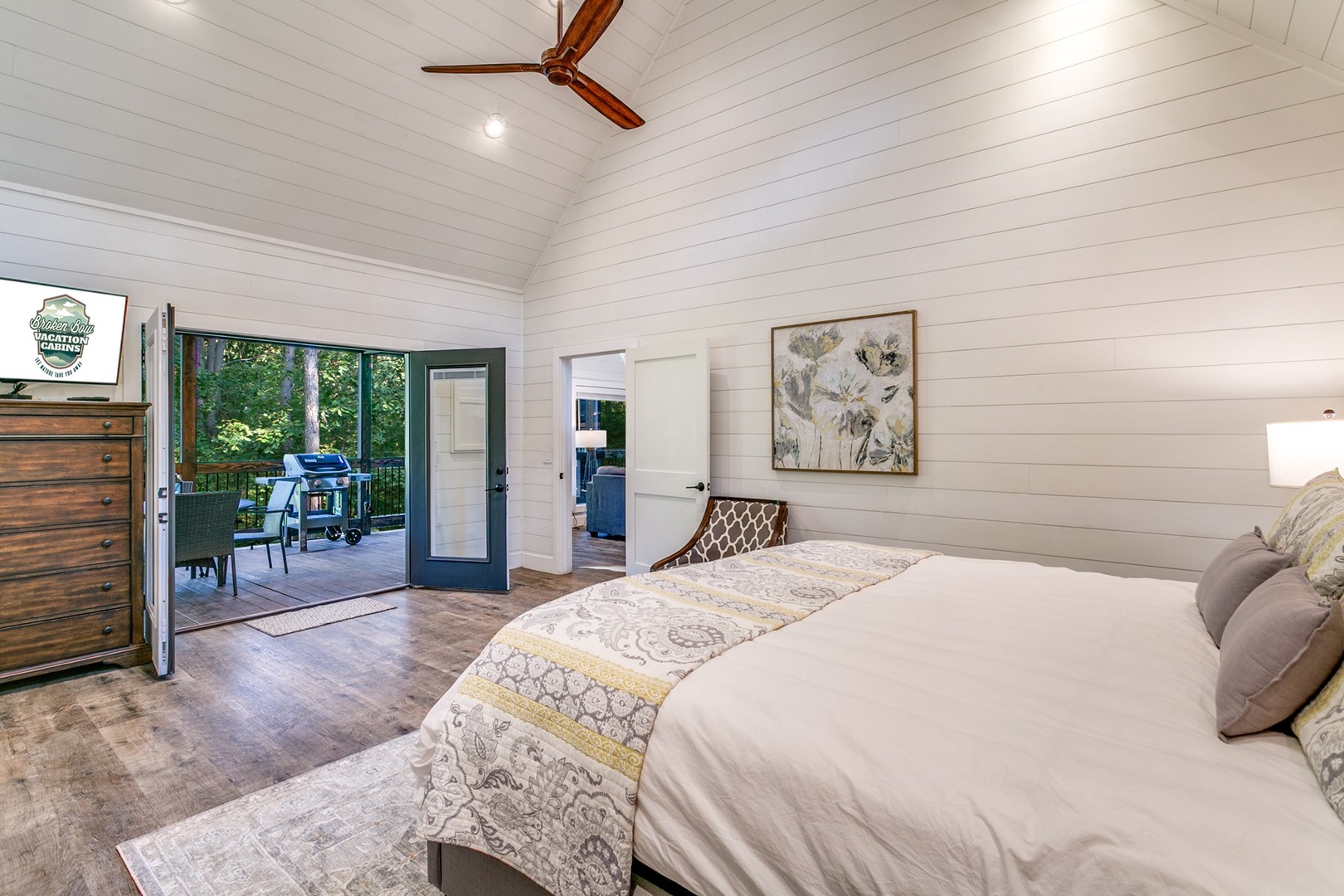 In the bedroom, a king-size hybrid Serta mattress promises restful nights and luxurious comfort. You'll find ample storage in the bedroom closet, and French doors lead directly from the bedroom to the deck. Here, a charming seating area surrounds an outdoor gas fireplace with a TV, perfect for enjoying crisp evenings, alongside an outdoor dining table overlooking the serene woods. The deck also features a propane grill for barbecues and an inviting hot tub for ultimate relaxation. The spacious bathroom offers a large shower for two, a separate bathtub, a private water closet, and a convenient washer and dryer.