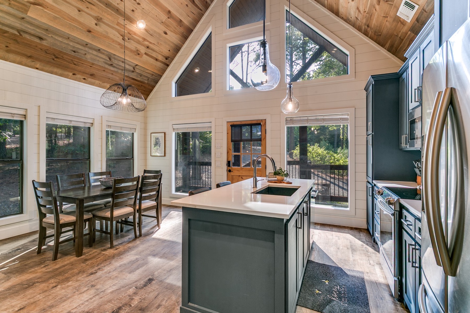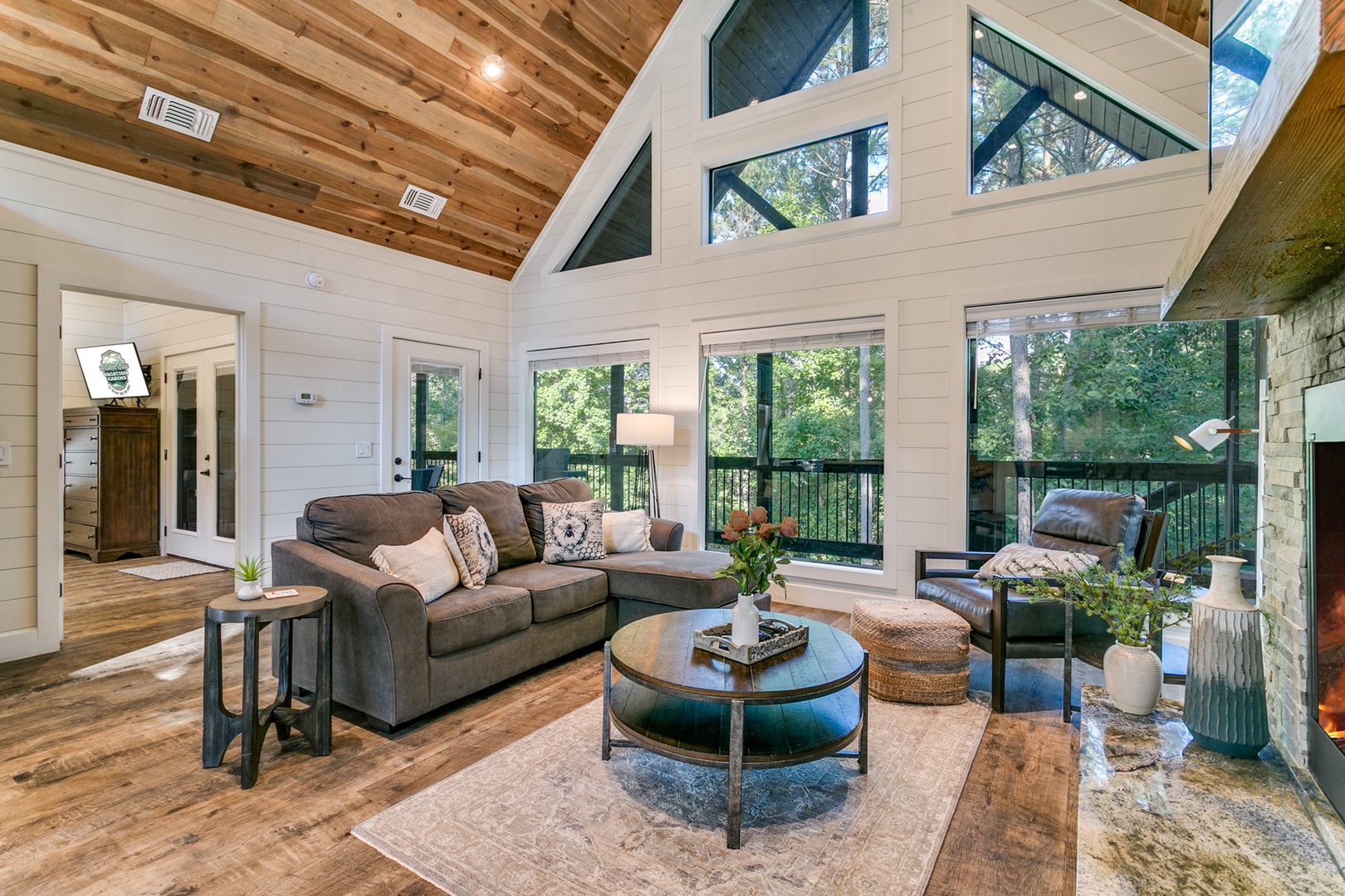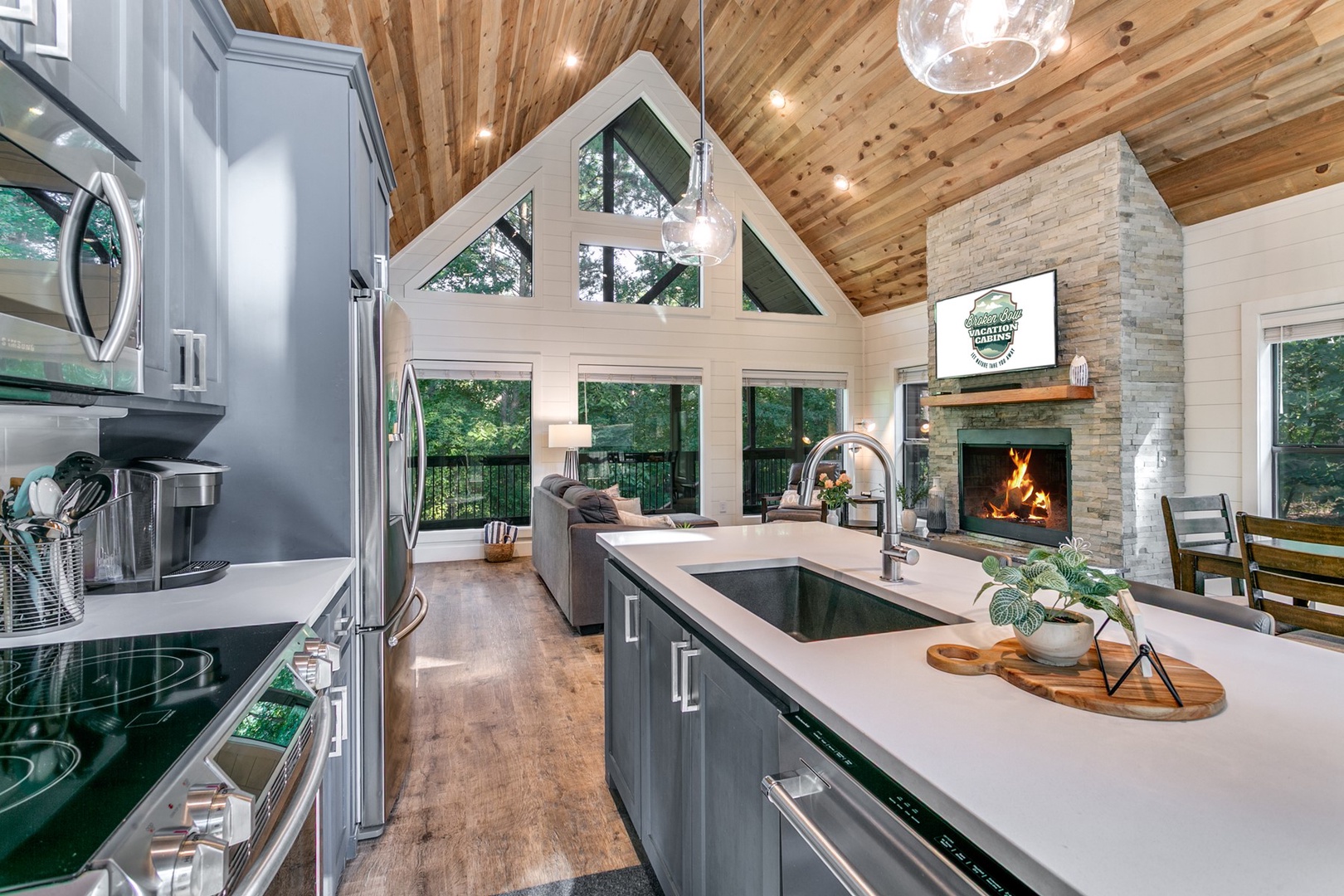 Step inside and immediately feel connected to nature as multiple windows frame stunning views of the surrounding trees. The modern kitchen is a chef's delight, fully stocked with dishes and cooking utensils, and equipped with everything you need for your morning brew, including a Keurig, drip coffee maker, and French press. The comfortable living room boasts a wall of windows overlooking the woods, a large TV for entertainment, a queen-size pullout couch for extra guests, and a selection of games for those cozy rainy days. It seamlessly opens onto the expansive deck, extending your living space outdoors.