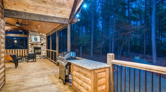 The outside area offers seating in front of the gas burning fireplace (seasonal October 15th – April 15th) with an HDTV mounted above. The hot tub (drained and sanitized after each reservation) is available via a covered deck. The grill (propane provided) sits by granite top counter for cooking convenience. The deck has a seating area and a table and chairs for 2. In the outside area sit around the open fire pit making memories while roasting marshmallows under the starry sky. There is a circle gravel drive for bringing your boat with you.