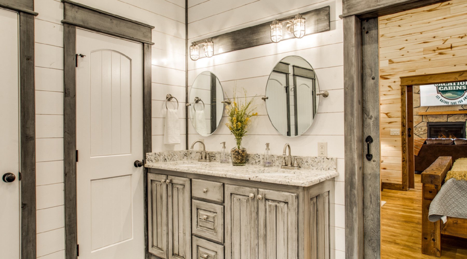 A bistro style table and gas grill (propane provided) as well as seating by the gas log fire place with easy on timer switch (seasonal October 15th – April 15th) are located on the outdoor decks. There is an HDTV with DirecTV package (PPV not provided) and a 4-5 person hot tub. The driveway can accompany cars and trailers. Holly Creek is just minutes from Hochatown attractions and restaurants.