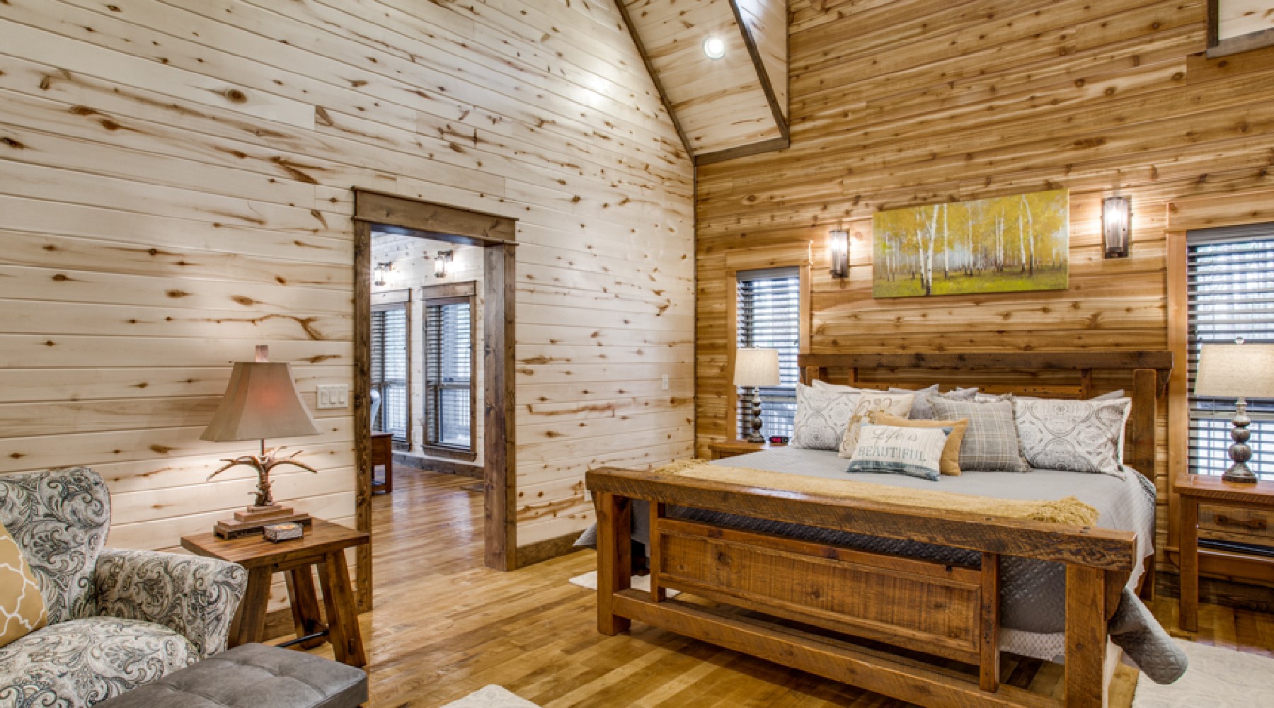 In the bedroom you will find a king size pillow top mattress wrapped in luxury linens with plenty of pillows. An HDTV is mounted on the wall for late night viewing. Enjoy the outdoor deck with hot tub by stepping through the private French doors of the bedroom. The large bathroom is off of the bedroom and has the ultimate accommodations for relaxation with a soaking tub, tiled walk-in shower for two with dual shower heads plus rain heads and granite bench seats and granite double vanity. The laundry closet is located in the bath area.