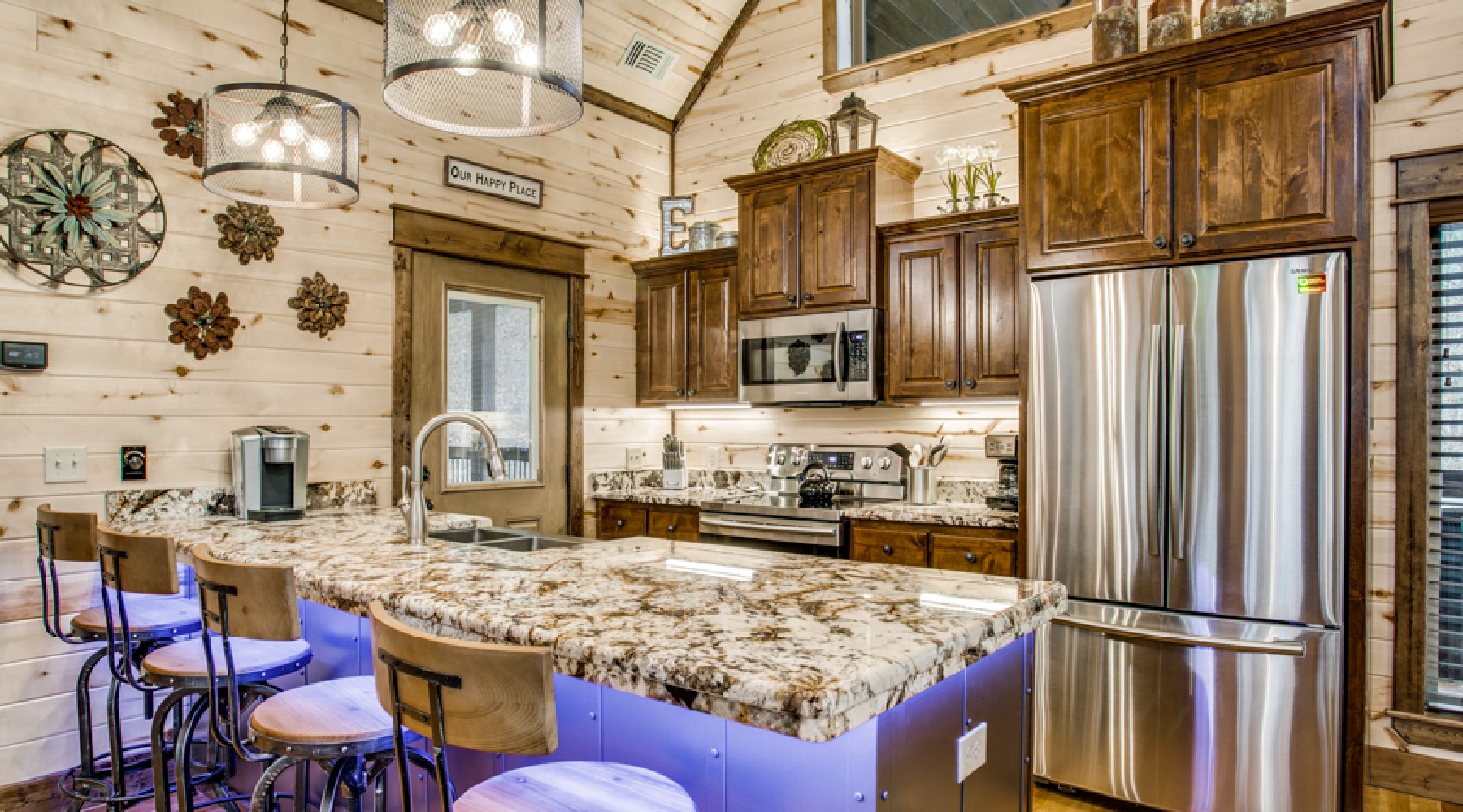Walk into this spacious open floor plan to find all the comforts you expect on a relaxing get away. The floor to ceiling custom flagstone rock hearth is the focal point of this room. The gas log fireplace (seasonal October 15th – April 15th) has an easy on/off timer to ensure you stay warm as you watch your favorite shows on the HDTV mounted above. There is plenty of seating that includes a sofa that converts to queen sleeper.