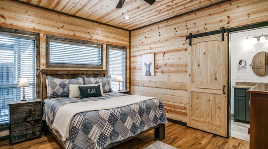 Into The Woods is a spacious 3-bedroom cabin located on a corner lot in Timber Creek Trails, phase 6. The living area has sofa and chair seating in front of a gas burning fireplace (seasonal October- April 15th). The TV is mounted above the fireplace and features a Smart TV for your app usage. The cabin has Direct TV channeling for all TV’s (PPV not available) The kitchen is equipped with dishwasher, wine fridge, microwave and glass cook top stove with electric oven. The cabinets are stocked with dinnerware, eating utensils, cookware, and bake ware. The dining table seats 8. Additional seating is provided at the island with stools.