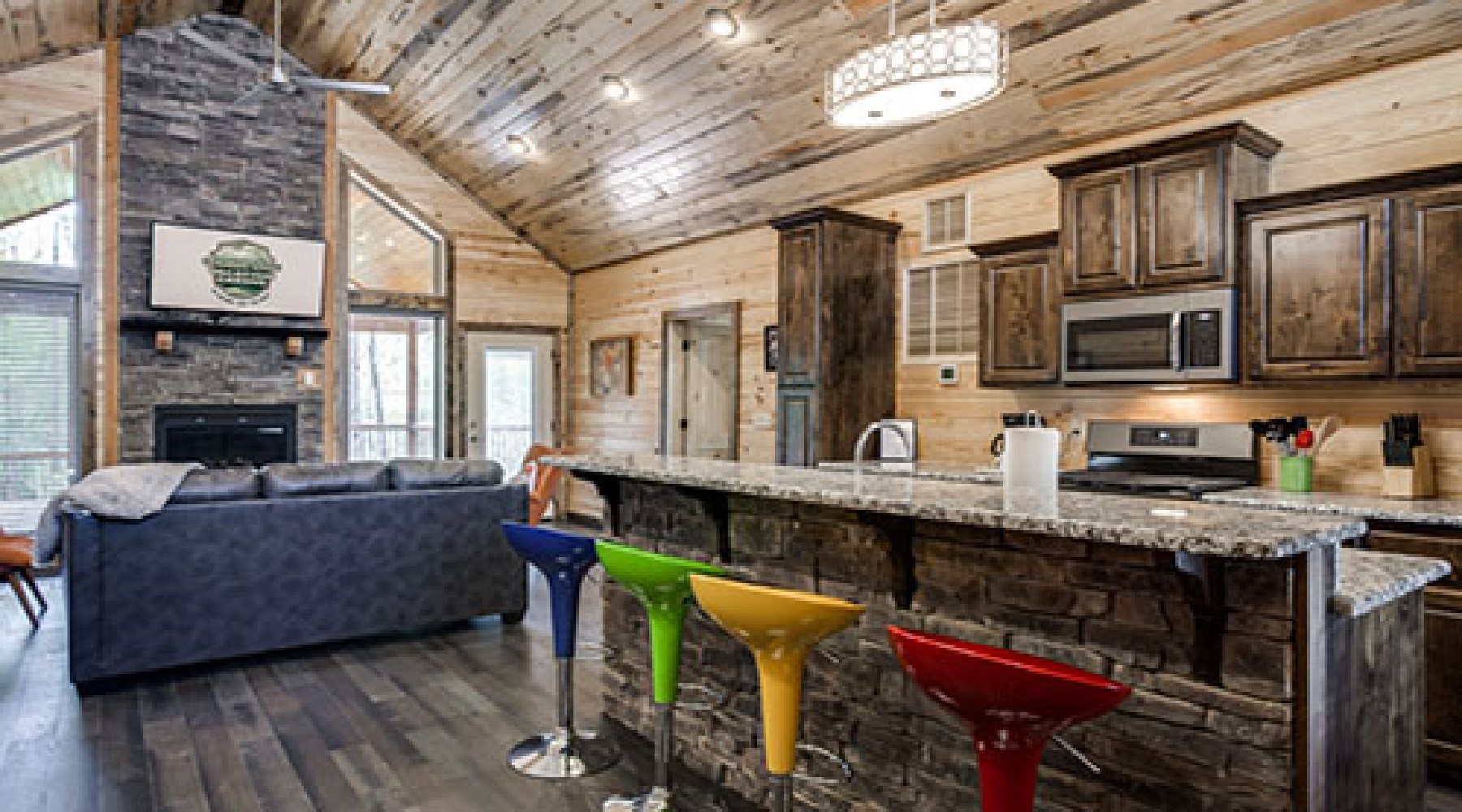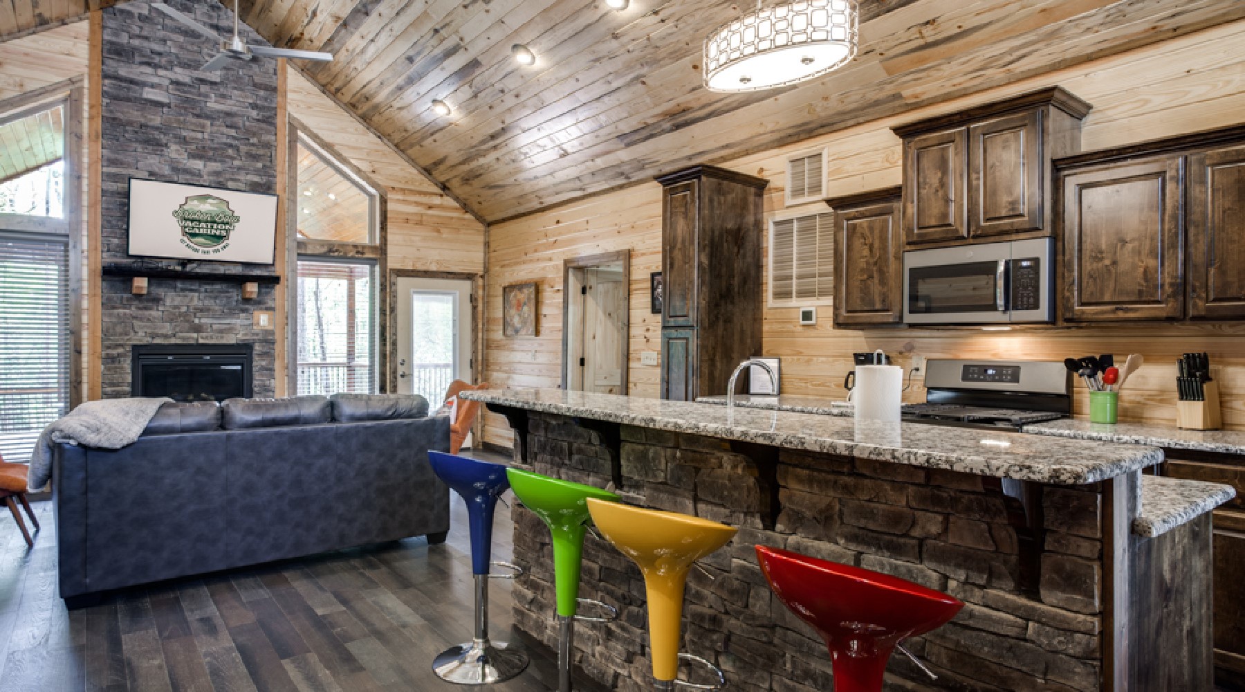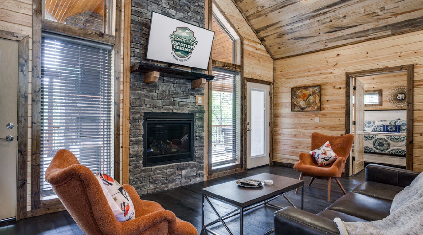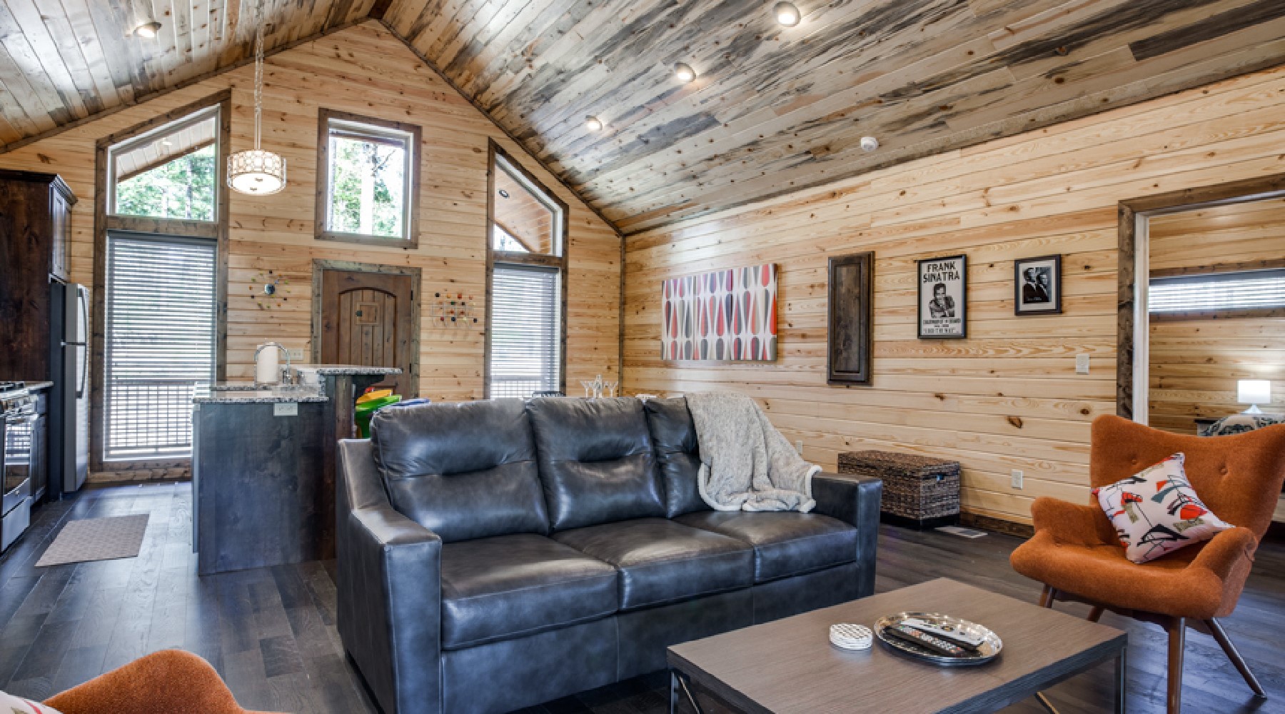 My Way is a 2-bedroom cabin located in Eagle Mountain West Development that accommodates up to 6 guests. This custom build is decorated with mid-century modern pops of color. A welcoming front porch spans the length of the cabin. Through the front door you will find a spacious living and kitchen area. The kitchen has fingerprint resistant stainless appliances including gas stove/oven, refrigerator, dishwasher and microwave. There is a dining table with seating for 6 and island bar seating for another 4. The living room has seating with a sofa converting to a queen sleeper and wing chairs. The living area gas-burning fireplace (seasonal October 15th – April 15th) has an easy on switch with timer. A 55″ HDTV with DirecTV (PPV not available) package is mounted above the fireplace on the rock hearth.
