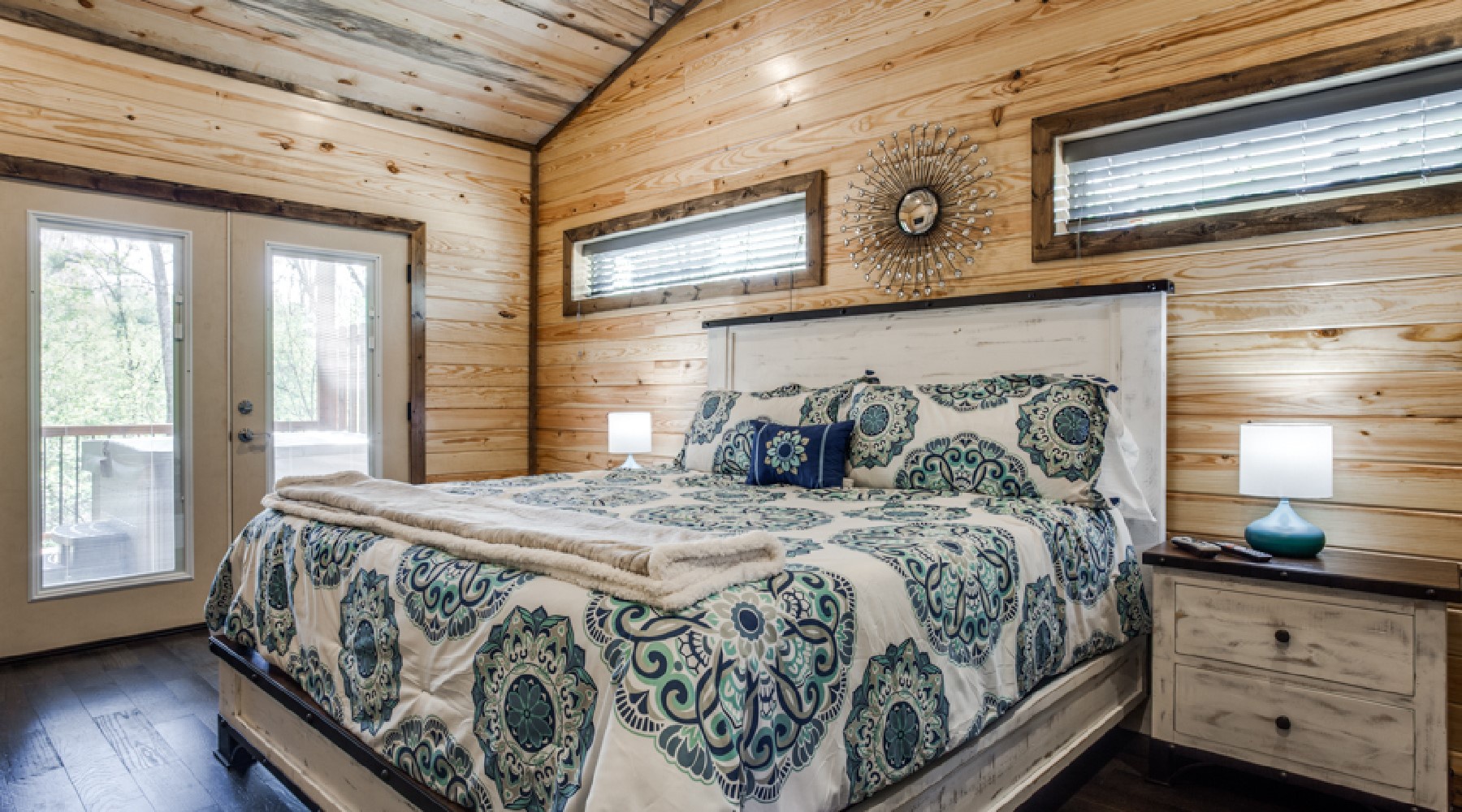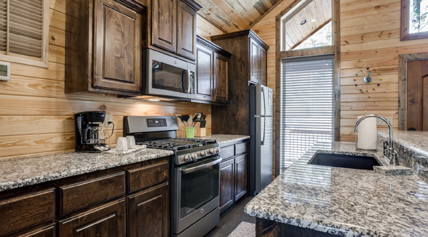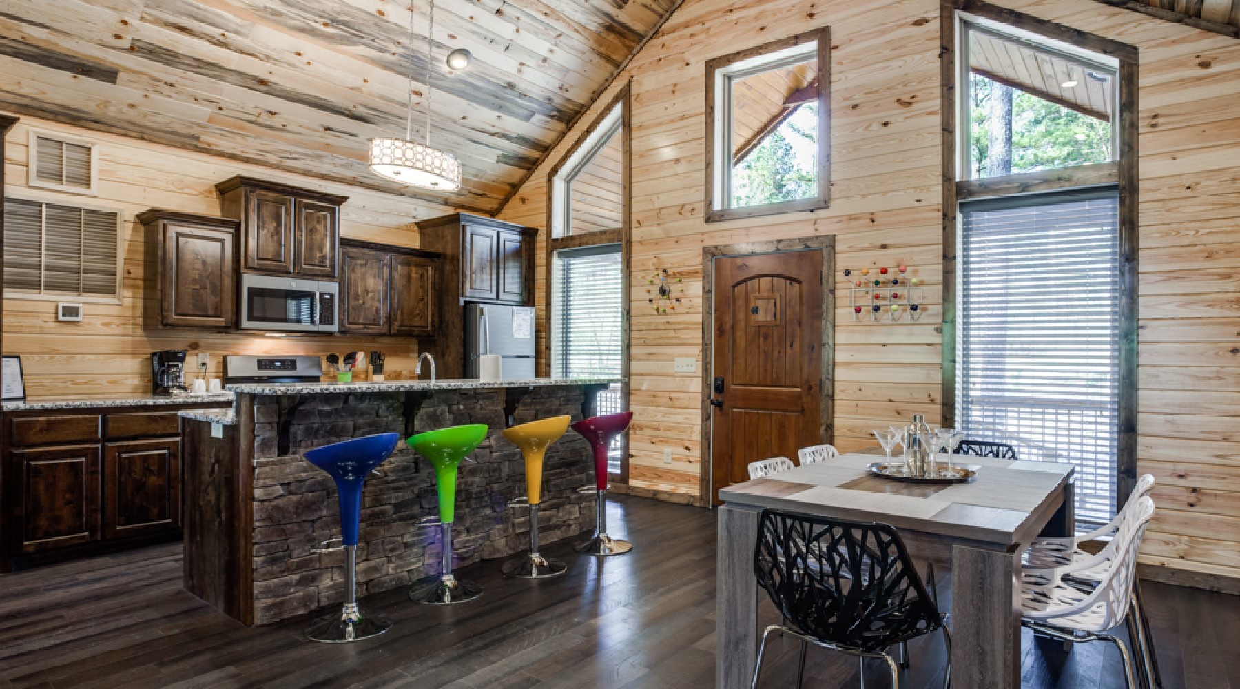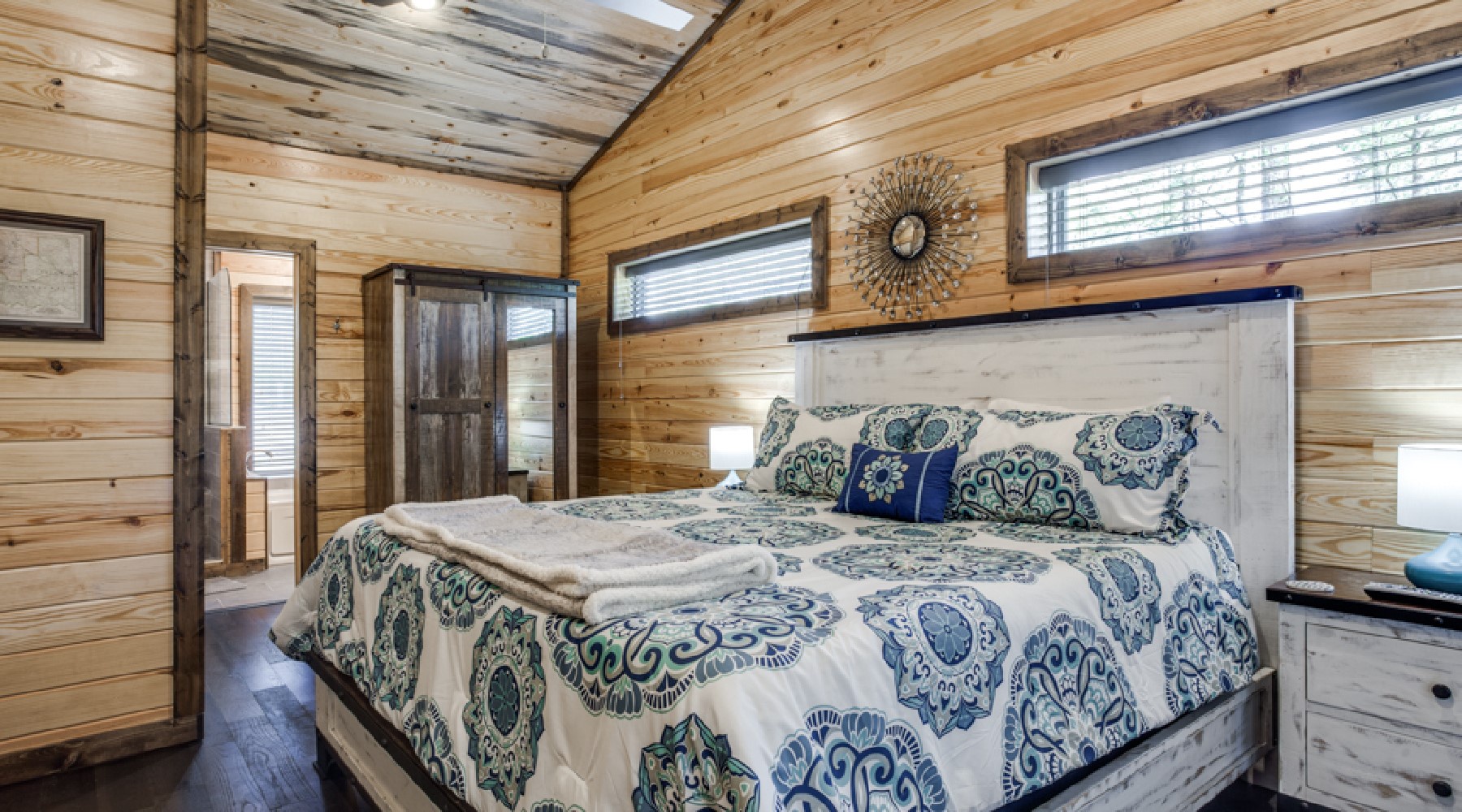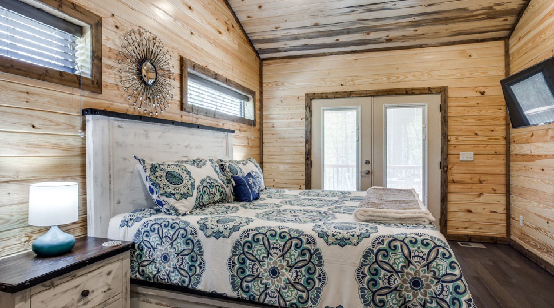 My Way is a 2-bedroom cabin located in Eagle Mountain West Development that accommodates up to 6 guests. This custom build is decorated with mid-century modern pops of color. A welcoming front porch spans the length of the cabin. Through the front door you will find a spacious living and kitchen area. The kitchen has fingerprint resistant stainless appliances including gas stove/oven, refrigerator, dishwasher and microwave. There is a dining table with seating for 6 and island bar seating for another 4. The living room has seating with a sofa converting to a queen sleeper and wing chairs. The living area gas-burning fireplace (seasonal October 15th – April 15th) has an easy on switch with timer. A 55″ HDTV with DirecTV (PPV not available) package is mounted above the fireplace on the rock hearth.
