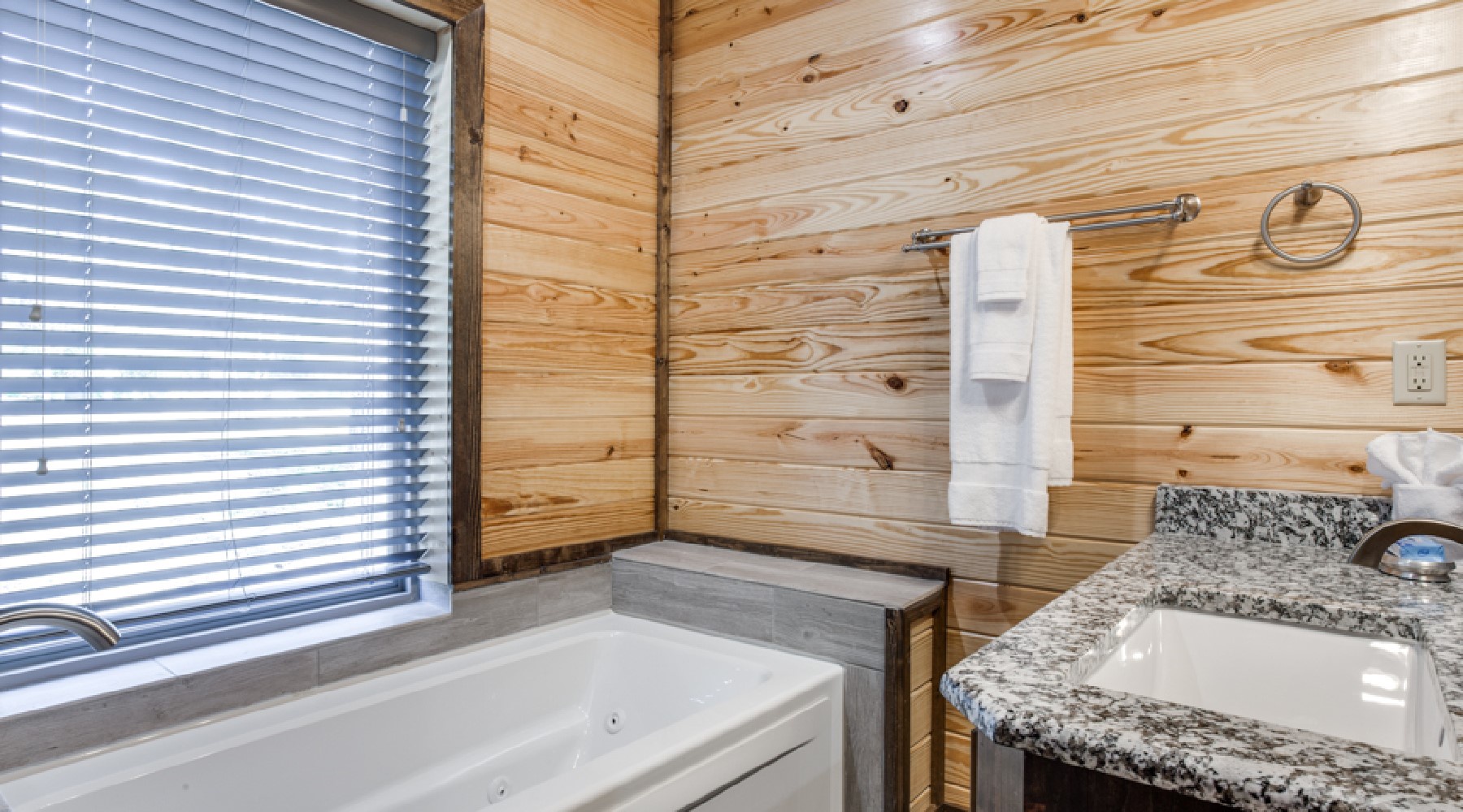 There are two bedrooms off the living room. Each bedroom has a king comfort memory mattress wrapped in luxurious linens. Each bedroom has a 43″ HGTV with DirecTV package. There is a bathroom in each of the bedrooms. Each bath has a jacuzzi tub, tiled walk-in shower and single vanity.