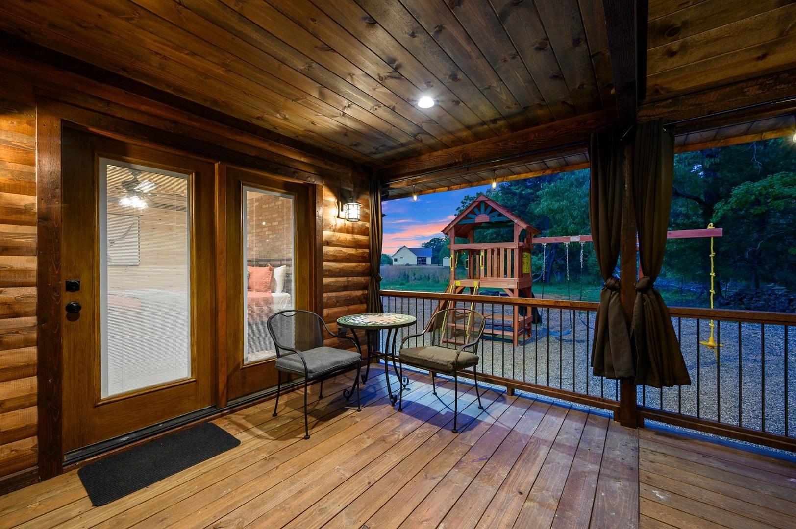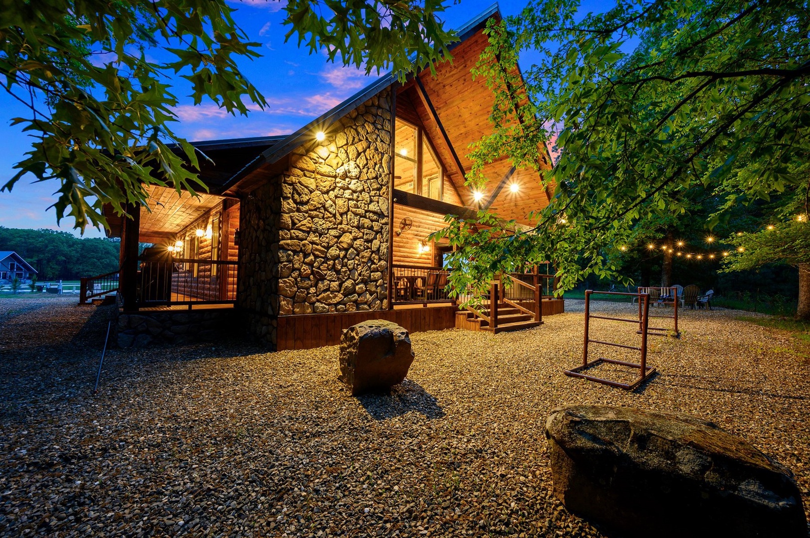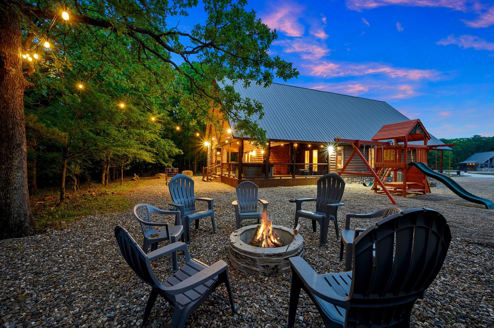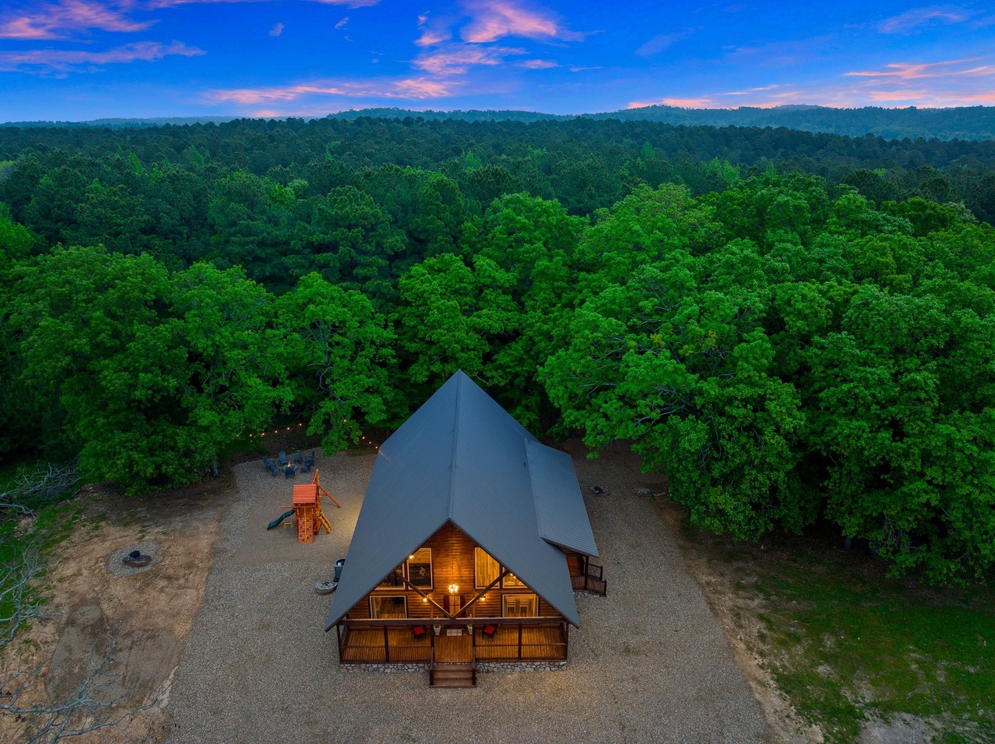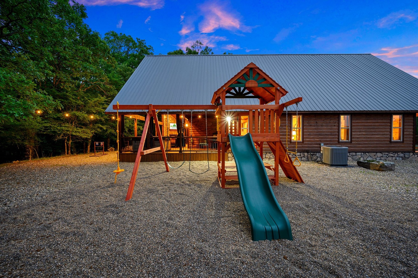 Escape to Phisticated Fun, a luxurious two-bedroom cabin with a spacious loft, perfectly designed for sophisticated fun and relaxation. Comfortably accommodating up to seven guests, this cabin offers a refined retreat that blends rustic charm with modern convenience. The open-concept main floor invites you to unwind in the elegant living area with a gas fireplace (seasonal), or gather around the island in the fully stocked kitchen. After an exciting day exploring Hochatown, retire to one of the two downstairs private King-sized bedrooms. Each has a private en-suite bathroom, big screen TV and access to the deck. Upstairs, the loft with 3 twin beds, is an entertainment haven featuring a shuffleboard, foosball table, big screen streaming TV and an arcade game table. The large outdoor deck includes a private hot tub, gas fireplace (seasonal), large streaming TV, a gas grill (propane provided) and a dining area. Just off the deck is a children’s playset, and cornhole, ladder ball and washer toss for the adults.