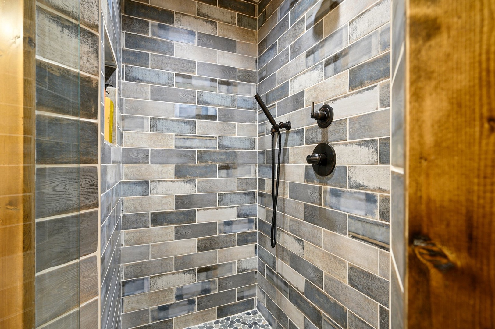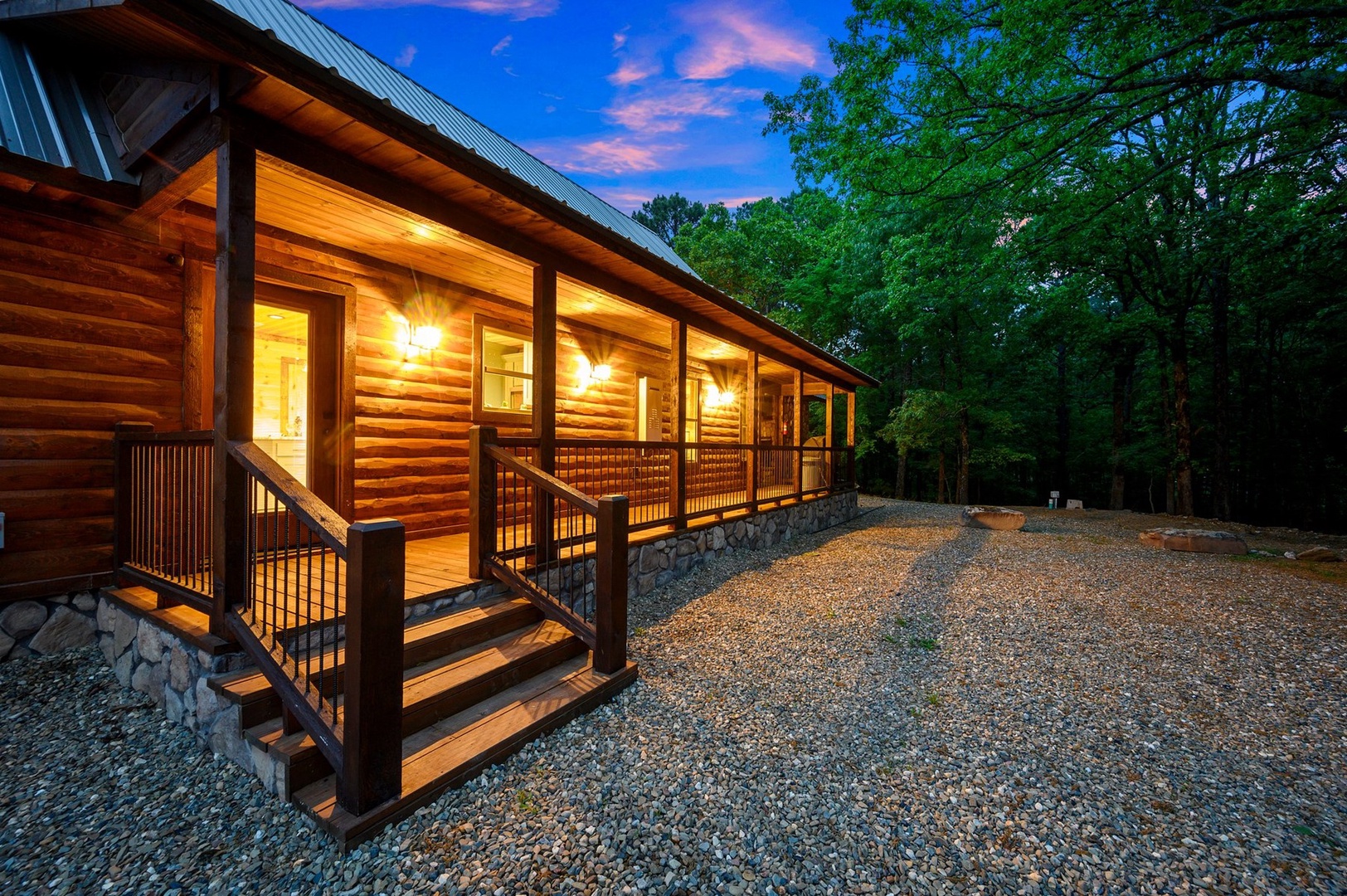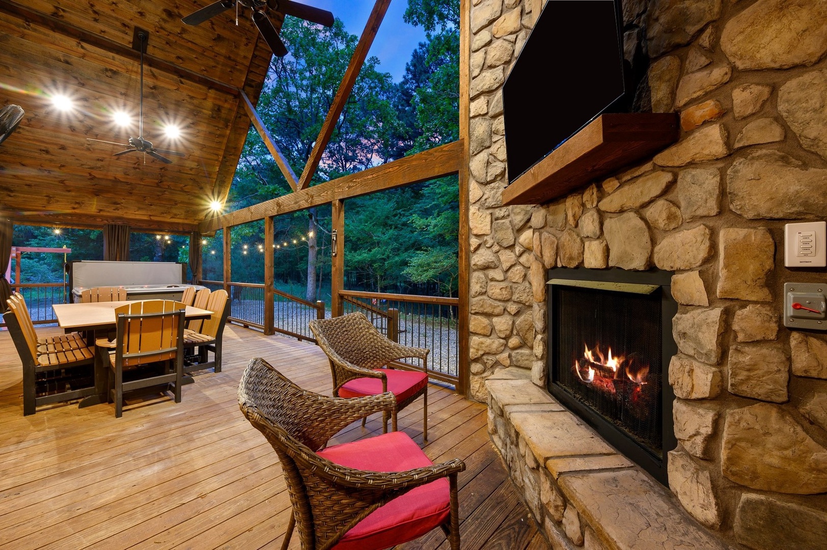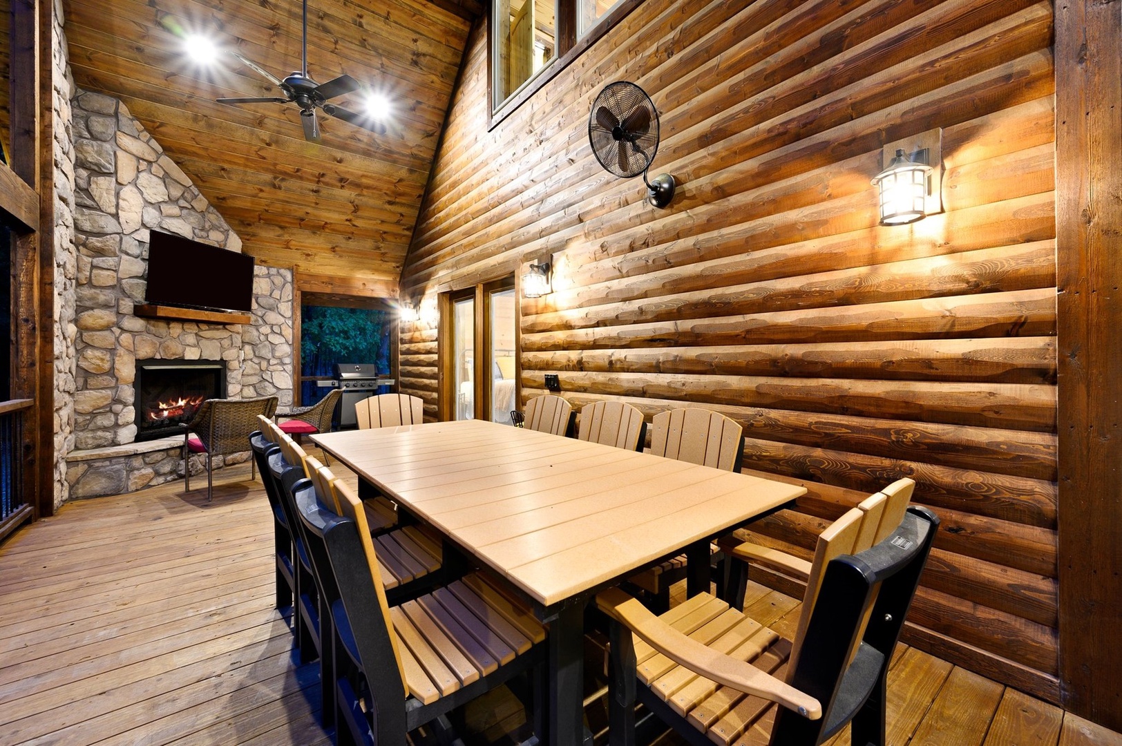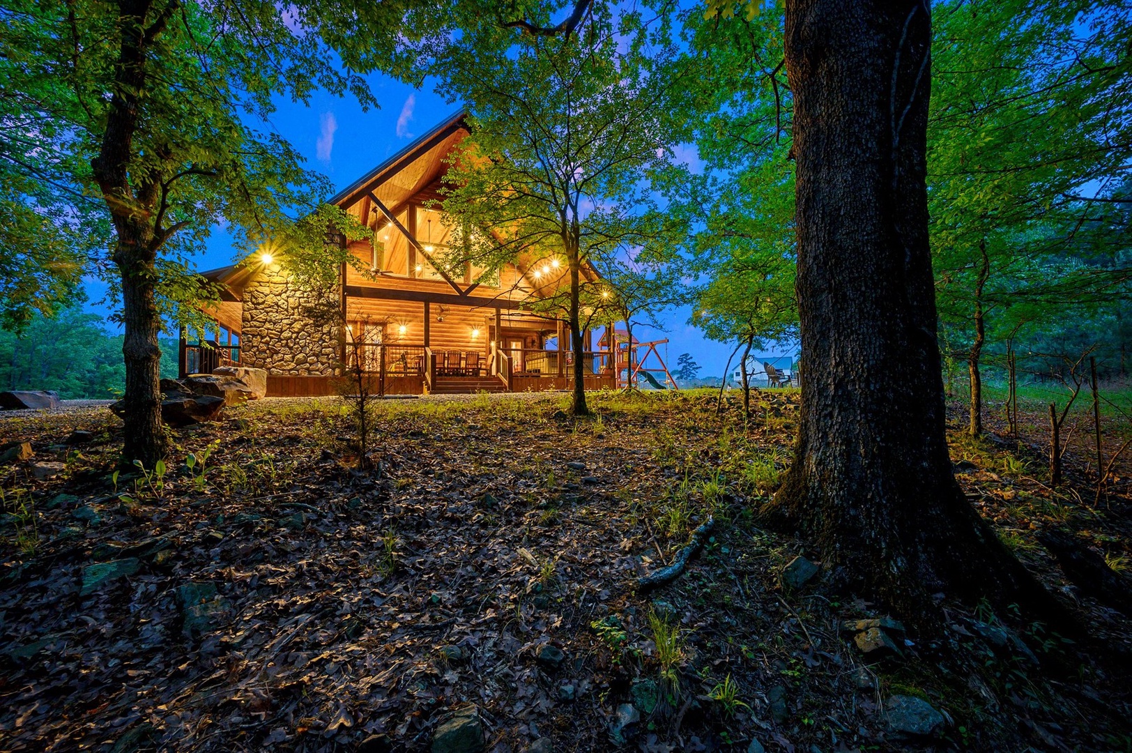Escape to Phisticated Fun, a luxurious two-bedroom cabin with a spacious loft, perfectly designed for sophisticated fun and relaxation. Comfortably accommodating up to seven guests, this cabin offers a refined retreat that blends rustic charm with modern convenience. The open-concept main floor invites you to unwind in the elegant living area with a gas fireplace (seasonal), or gather around the island in the fully stocked kitchen. After an exciting day exploring Hochatown, retire to one of the two downstairs private King-sized bedrooms. Each has a private en-suite bathroom, big screen TV and access to the deck. Upstairs, the loft with 3 twin beds, is an entertainment haven featuring a shuffleboard, foosball table, big screen streaming TV and an arcade game table. The large outdoor deck includes a private hot tub, gas fireplace (seasonal), large streaming TV, a gas grill (propane provided) and a dining area. Just off the deck is a children’s playset, and cornhole, ladder ball and washer toss for the adults.