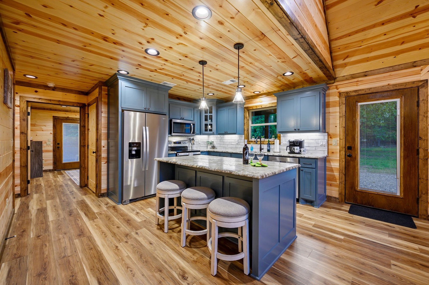- Central island with seating for three