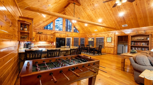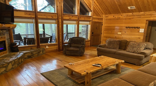 The cabin has three different “themed” rooms with 2 1/2 baths, all surrounding an open, custom designed great room with open family room, kitchen and dining room. A large antler chandelier is a dramatic centerpiece for the entire great room. The two main guest rooms feature skylight windows and high ceilings. The third bedroom is a bear themed room with a queen bed and child’s bunk bed. Talewater cabin will accommodate up to 7 guests (6 adults).