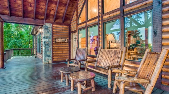 Talewater Cabin is a luxury three-bedroom cabin situated on the top of a mountain in Timber Creek Trails with a stunning view of the surrounding forest. A 2,200 square foot deck surrounds the entire cabin. Enjoy coffee (or hot chocolate) and a serene morning from the spacious decks. You can enjoy a morning sunrise on the two-level front deck. The upper deck is covered so you can enjoy the view regardless of the weather. The cabin is situated on 1.5 acres, with a backyard that is level and perfect for family games. The cabin also has a fire ring in the backyard. The back deck features a covered area with a hot tub and large rustic pine picnic table to enjoy family dinners outside.