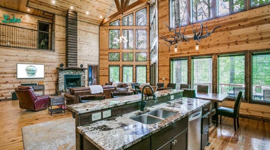 Tree Top Point Lodge is a large 4 Bedroom + Gaming/Bunk room/ 3.5 bath gorgeous cabin with over 3,500 sq. ft of heated/cooled living space. The cabin was built on a double lot with over 2 acres of pine trees and hardwoods. In fact, the owner cherished the natural beauty of the woods so much that two pine trees continue to grow up through the covered spa deck.